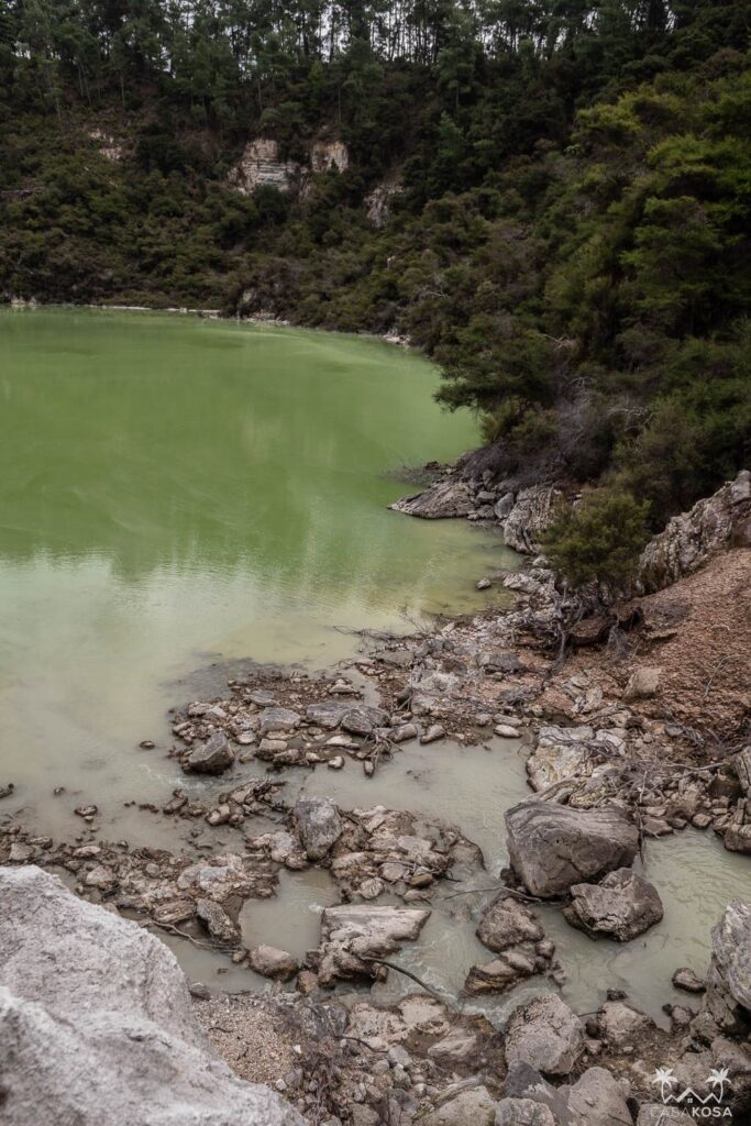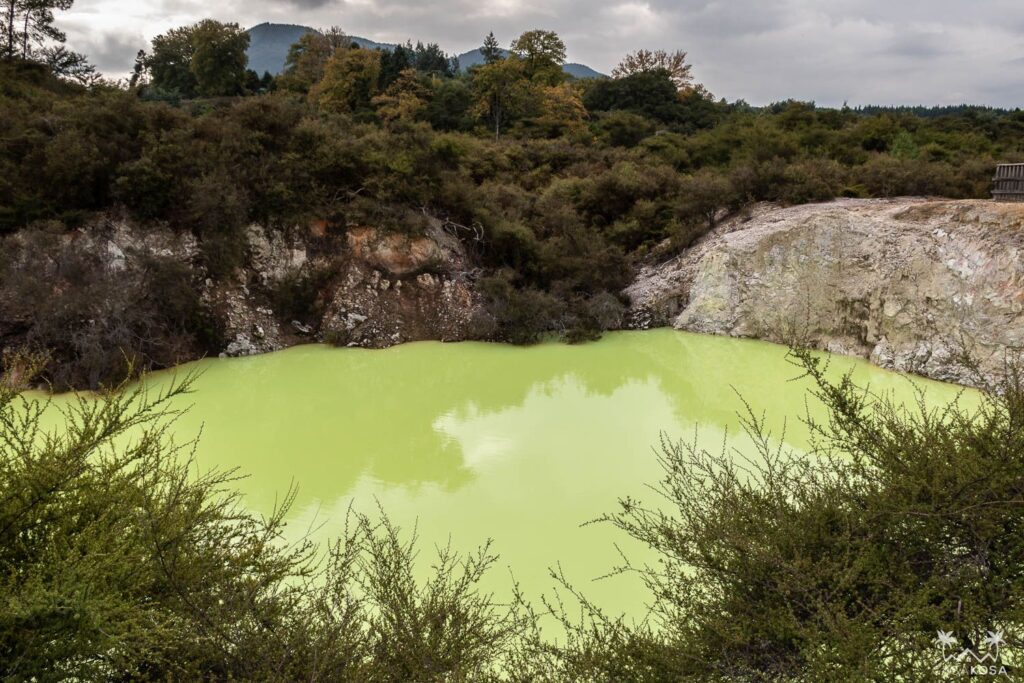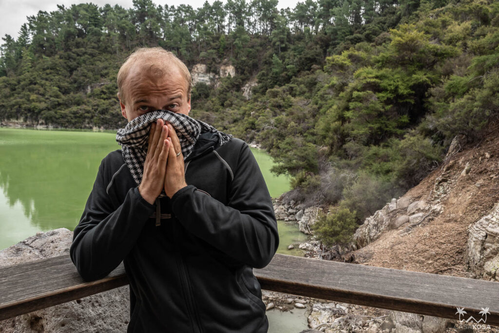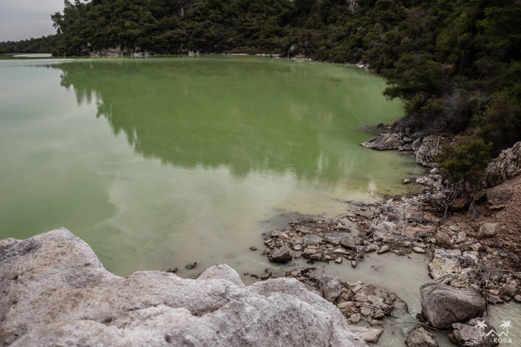 This place is really crazy! Wai-o-tapu Thermal Wonderland isn’t located directly in Rotorua but it’s very close and we visited on our way from Taupo. The products of geothermal and volcanic activity visible here are spectacular. We’ve never seen such weird natural volcanic art pieces and colorful lakes like the Champagne Lake or neon green Devil’s Bath. And quite surprisingly, we also saw some critters who didn’t mind the sulfur in the air. Have a look at our pictures.