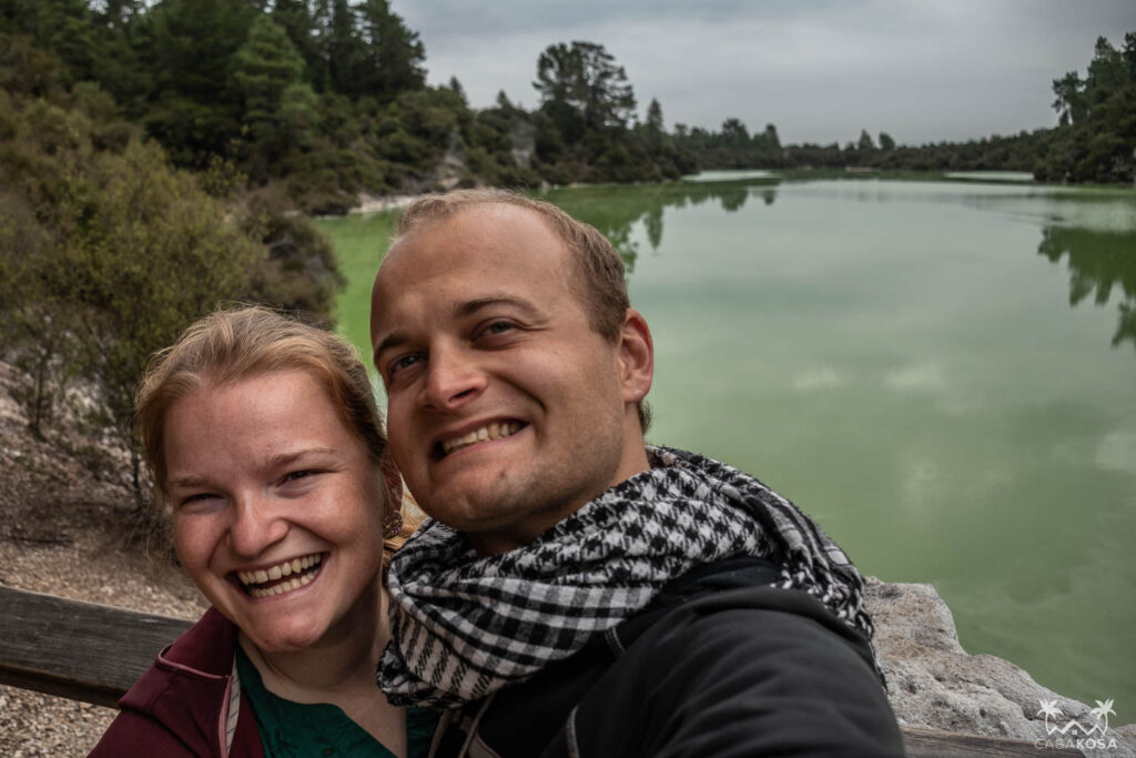The next and last part of our trip exploring the North Island after our visit to Taupo and Tongariro National Park was a bit different. During our Tongariro Crossing, we met Kendal and Kane from Adelaide and after several common stops on the track sharing all kinds of snacks, we realized we had similar plans for the remaining days in the North Island. And since we, hopefully mutually, found ourselves cool and fun, we decided to continue further together. And our new Australian friends had a car. Thus, we could ditch our favorite InterCity (bu)steed and join the more adult way of transportation. Our road trip from Taupo to Auckland was quite short, but very intense and full of adventure – we saw weirdly colored lakes close to Rotorua, did Black Water rafting in Waitomo, went to take some photos for Pepe’s mum in Hobbiton and gave our farewell to New Zealand in its biggest city – Auckland. Come to spend with us our last four days in the Land of the Long White Cloud.