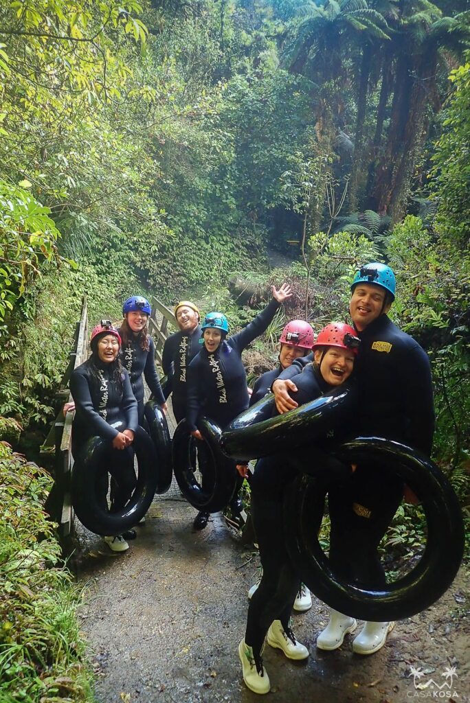 There are several places in New Zealand where you can find mysterious glow worms. We met some in a forest in Fox Glacier, as we wrote here, but wanted to see also the ones in a cave in Waitomo. And since our Australian friends wanted to do the Black Water rafting, and resorted to DARING Pepe after several cans of pre-made ginger beer+whiskey beverage the night before, we had no choice but to join them. That meant that instead of a peaceful sail through cave on a packed boat full of older glowworm observing amateurs we opted for a more adventurous version in wet suits, helmets and inflated tires around our asses, freezing off said asses and jumping ass first from small waterfalls in the cave. It was quite cool (did we mention freezing?), especially for Mia, who was very scared of jumping into water. Like, ANY water. But there’s nothing like a nice dose of peer pressure while standing on some slippery stones with an underground river coursing around your blueish feet to help with your childhood fears, amirite?