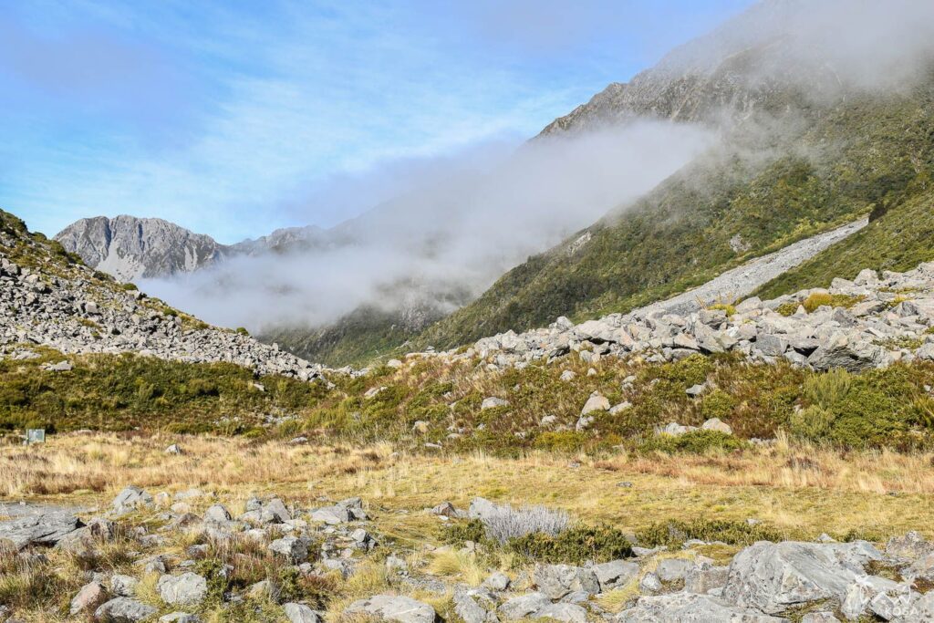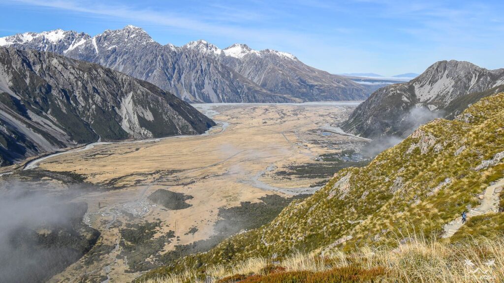 Mt Cook or Aoraki is the highest mountain in New Zealand (3724m, or almost exactly 40x the height of the Statue of Liberty, for our American friends). The national park is quite close to Tekapo, so it’s easy to do a day trip and hike round this giant. Our original intention was to do the famous Hooker valley track. However, as we learned in the Visitor Center of the national park in Aoraki Mount Cook village, the track had been damaged by floods and hence we had to find another option.