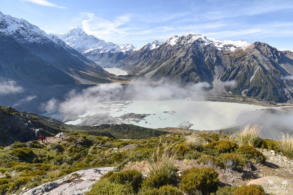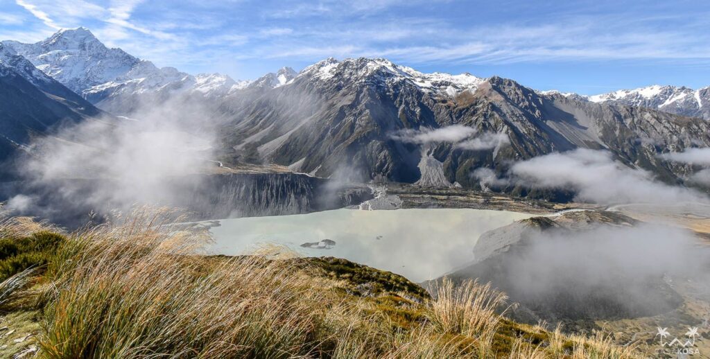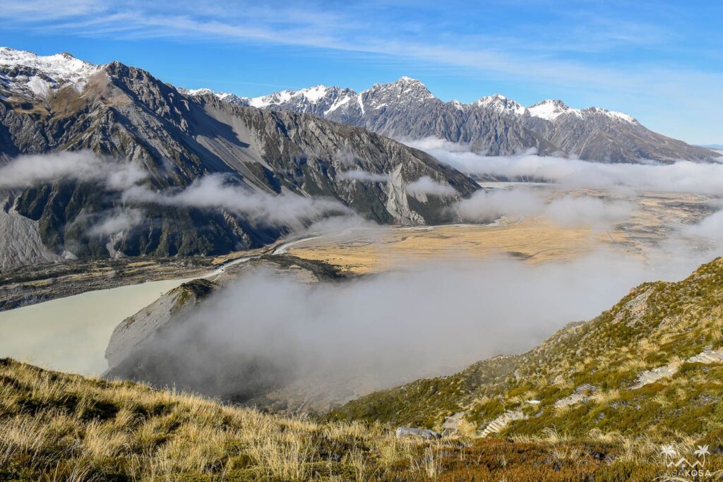 After Kea Point, we thought it could be a good idea to walk some 2200 stairs (yes, stairs) up to the freshwater lakes of Sealy Tarns to have an even better view of the Hooker valley and the surrounding peaks. Well, it wasn’t fun at all – most of the hike it looked like there won’t be any views because of a thick fog, so the whole ordeal seemed like a pointless and depressing blindfolded physical effort. Luckily, the fog cleared near the summit and we were rewarded with a few epic panoramas. Thus, even if the following day we could not walk properly, this climb was well worth the effort.