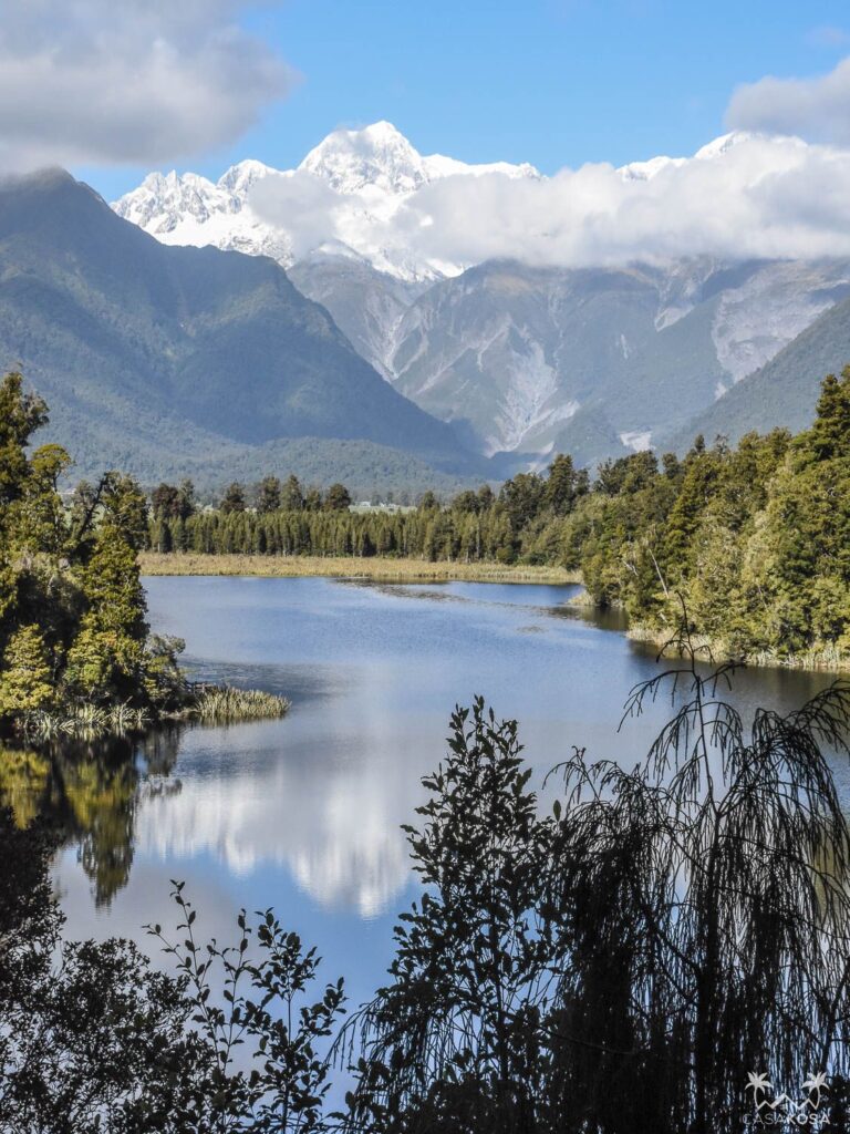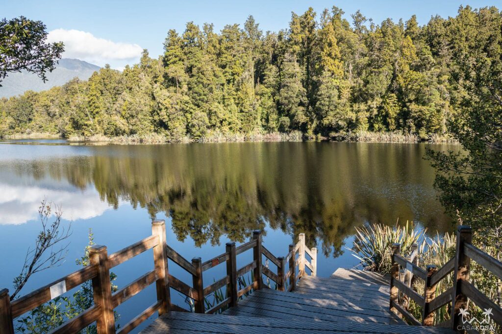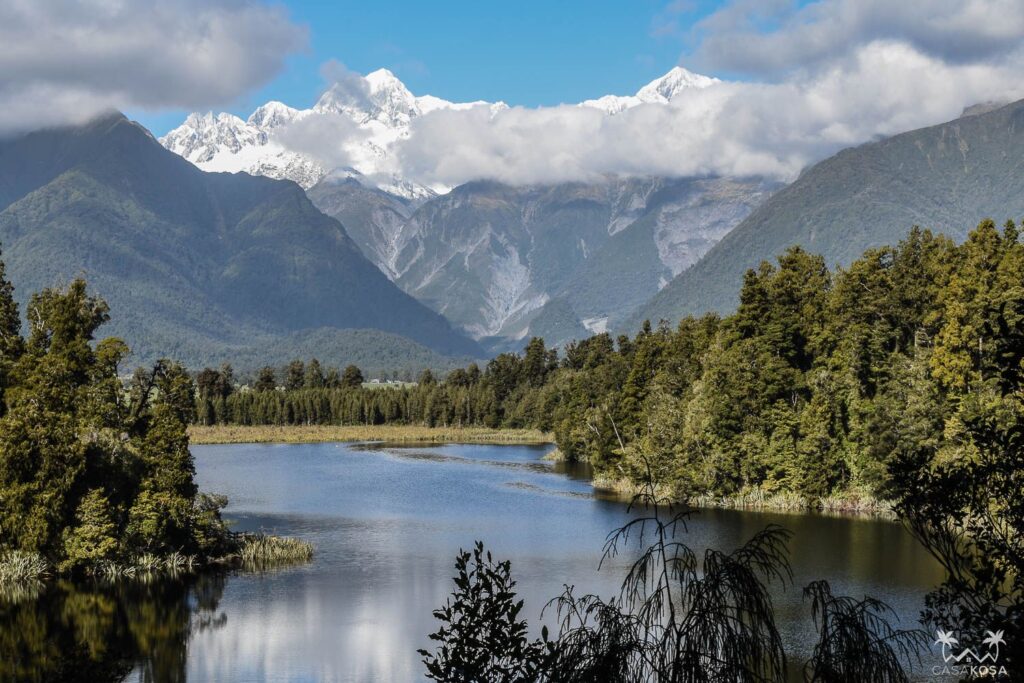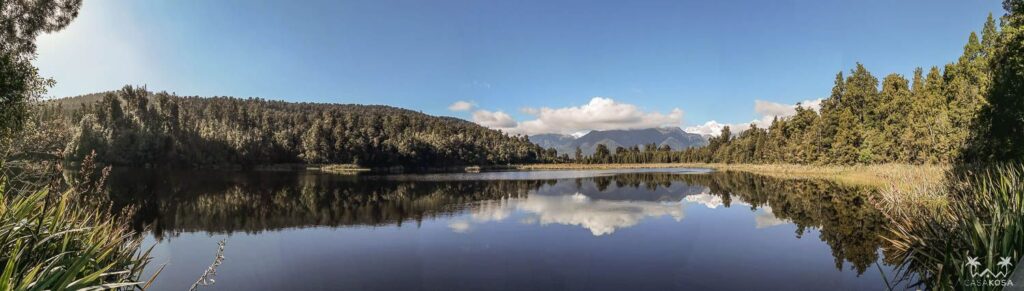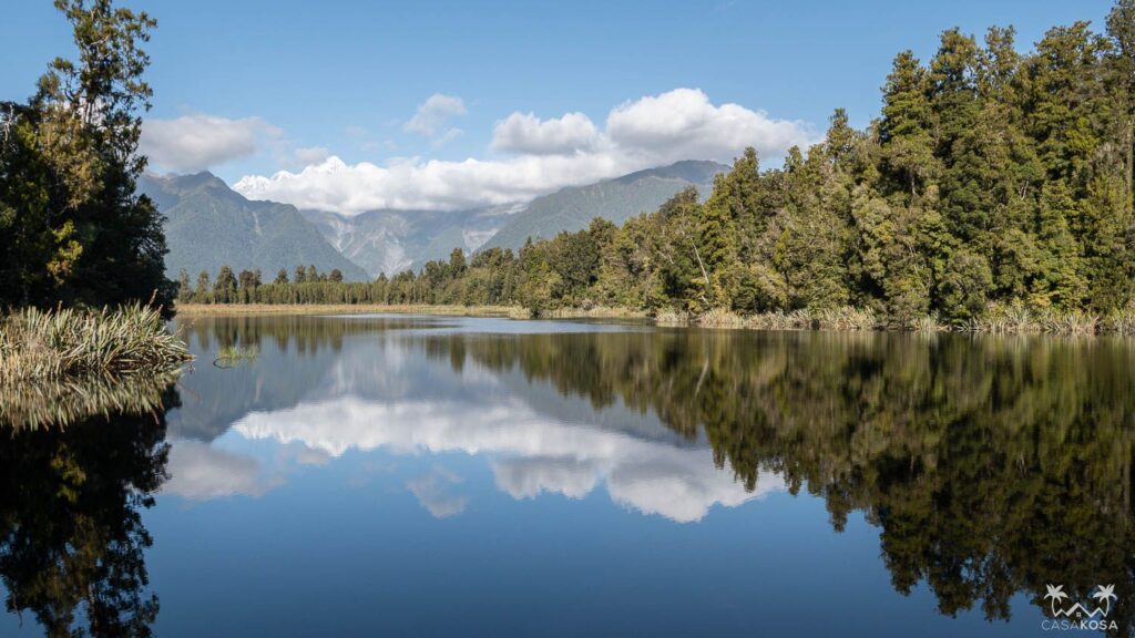 Our next stop on our bike trip was Lake Matheson. This lake is famous for its perfect reflections of Aoraki Mount Cook and Mount Tasman and is supposed to be the most photographed lake in New Zealand. So we parked our wheeled horses and were ready shoot some pictures while walking around the lake to improve that statistics. Even if the reflection wasn’t so perfect that day. As we learned later, you’re supposed to go there early in the morning to catch the calmest time and well, early in the morning we sleep.