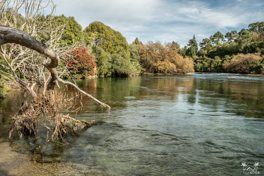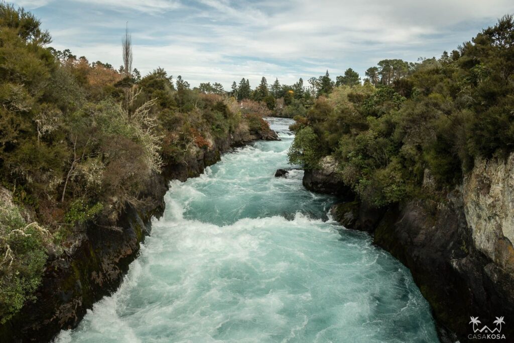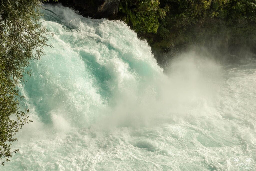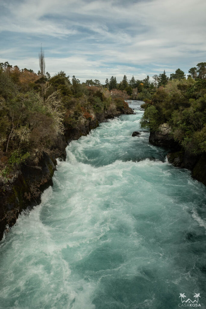 The falls themselves look small but powerful! The sheer volume of water from the Waikato River which is tumbling over the 15m wide and 10m deep falls makes a solid loud waterfally sound. There is a nice lookout walk we did and indulged this spectacle. If you are done with the views of the falls there are more walking trails closeby. And actually also a walking trail back to/from Taupo, the Spa Park to Huka Falls trail (1.5h). But as we had our bikes with us we just walked the short circuit and returned back.