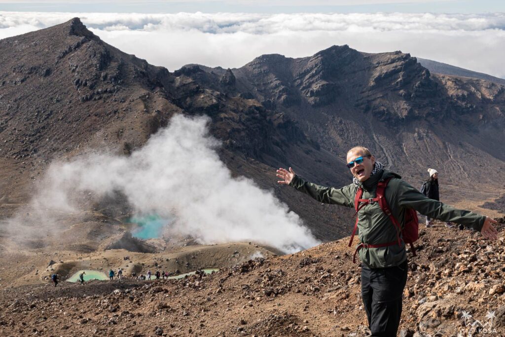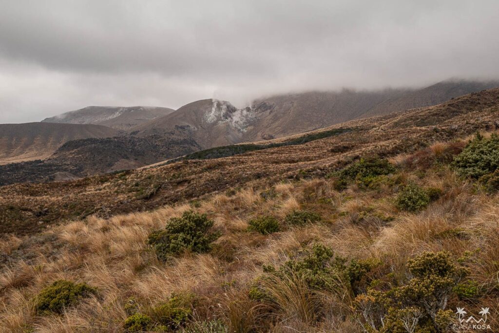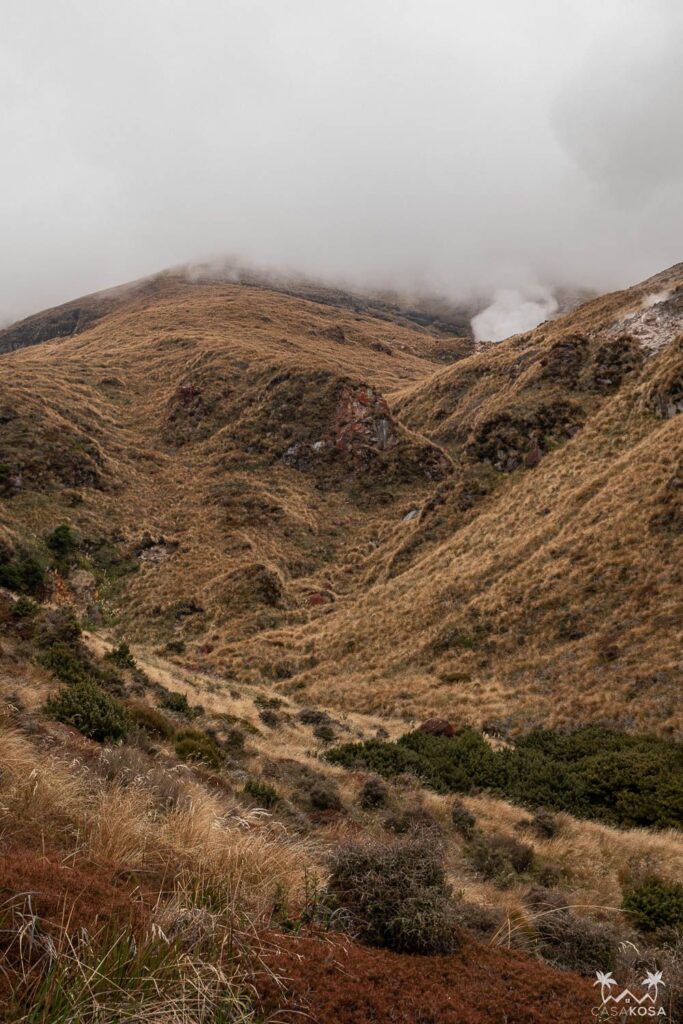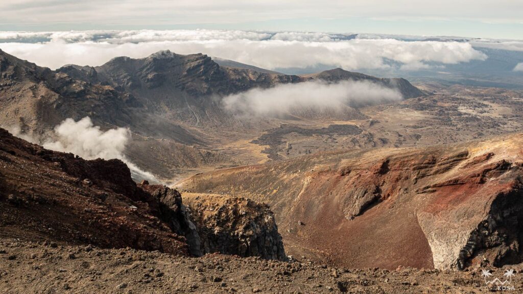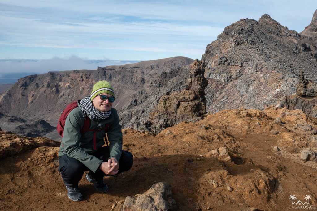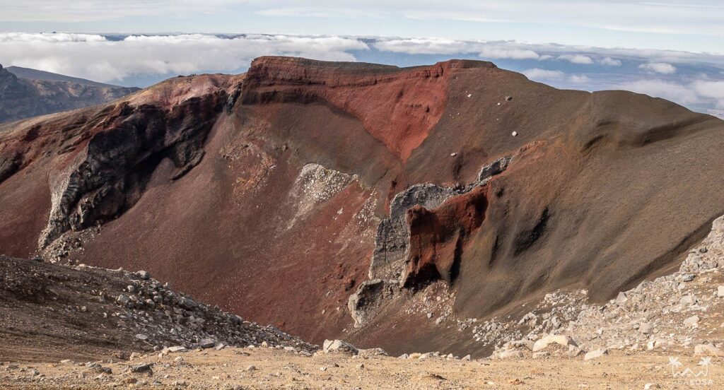 We started super early in the morning from the elevation 1120 m (sign 0 km – and there is one every km to keep you motivated) and started climbing up the Mangatepopo valley following the orange-looking stream. None of the water in the area is drinkable as it contains a plethora of funny volcanic chemicals that would make you pretty sick. We made a short side trip to Soda Springs (again, soda = drinkable, Soda Springs = nope) and after a 10 min stop and chat with our fellow hikers we continued on a steep way up to the saddle between Mount Ngauruhoe and Tongariro and to the South Crater. Some more steps up and we reached the highest point of the track – the Red Crater (1886m) and its sulfur smell.