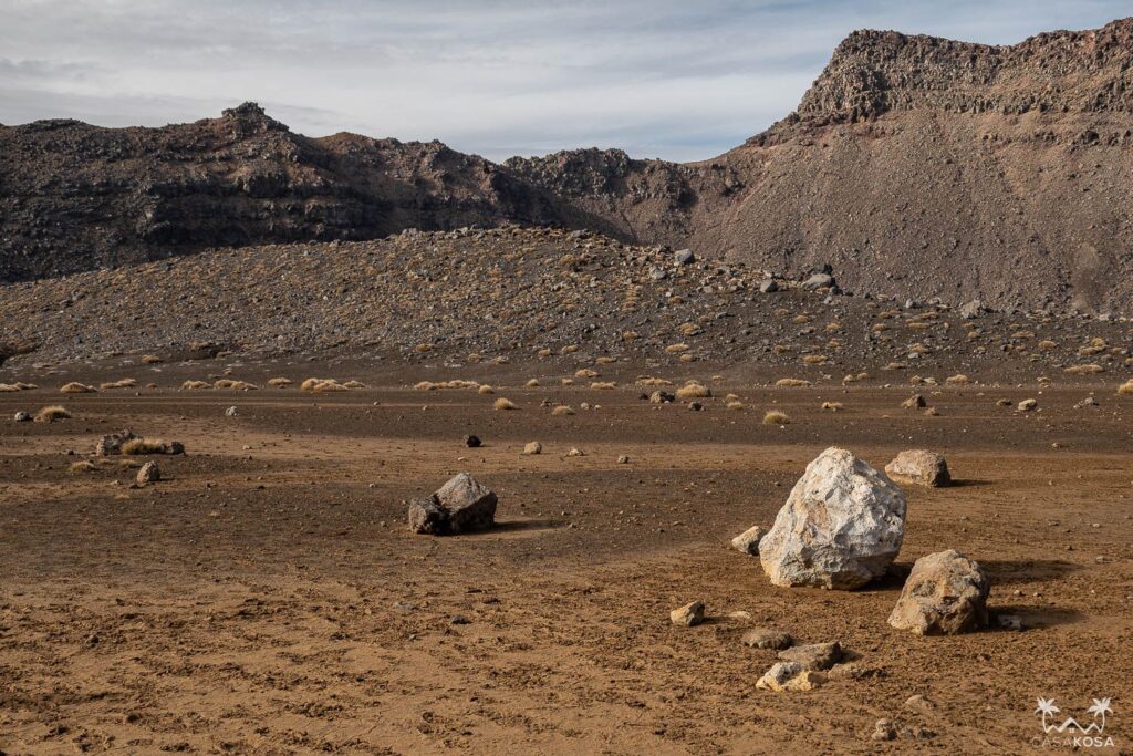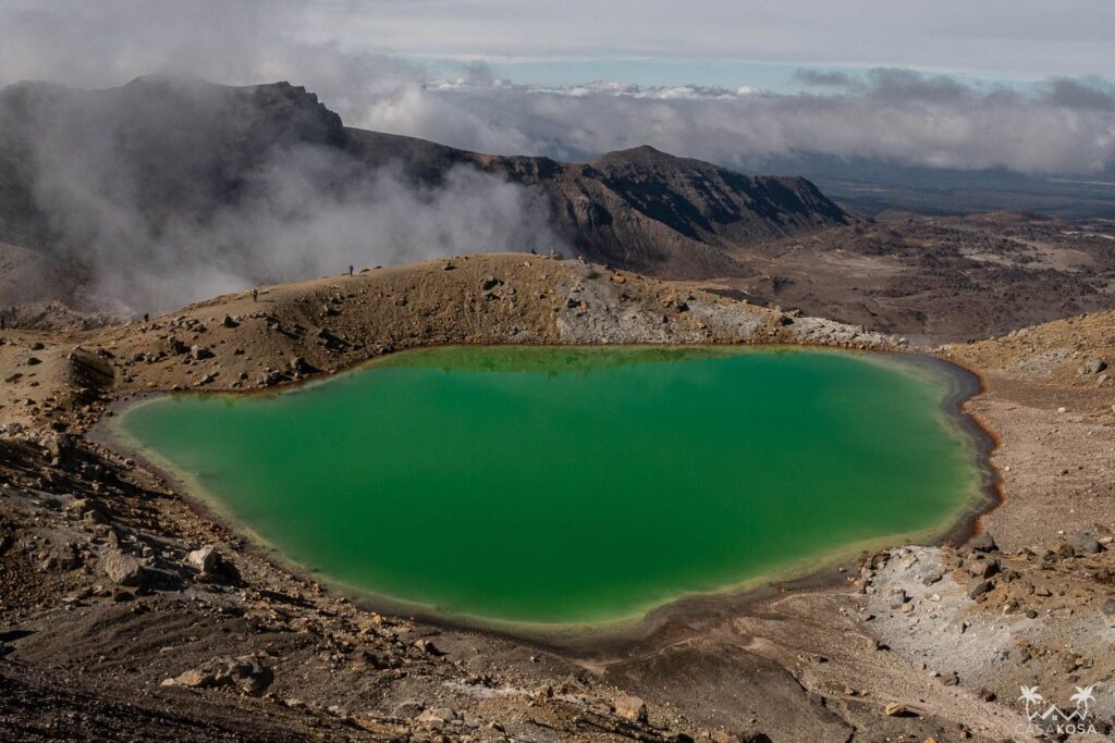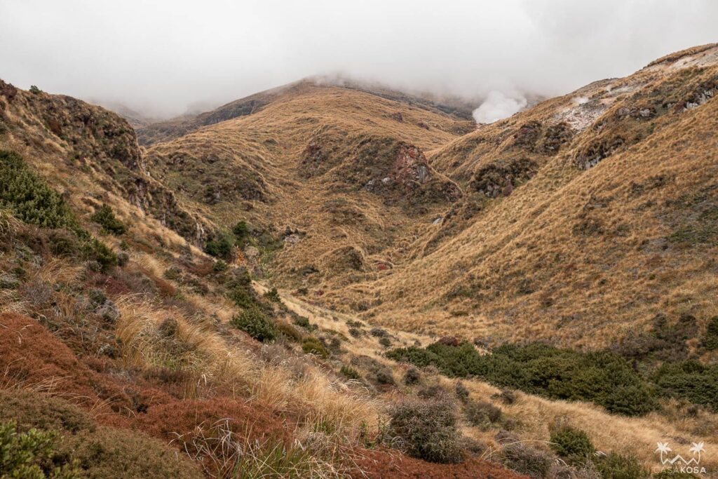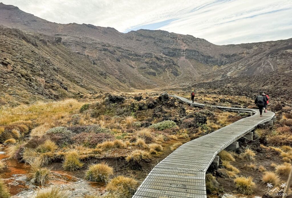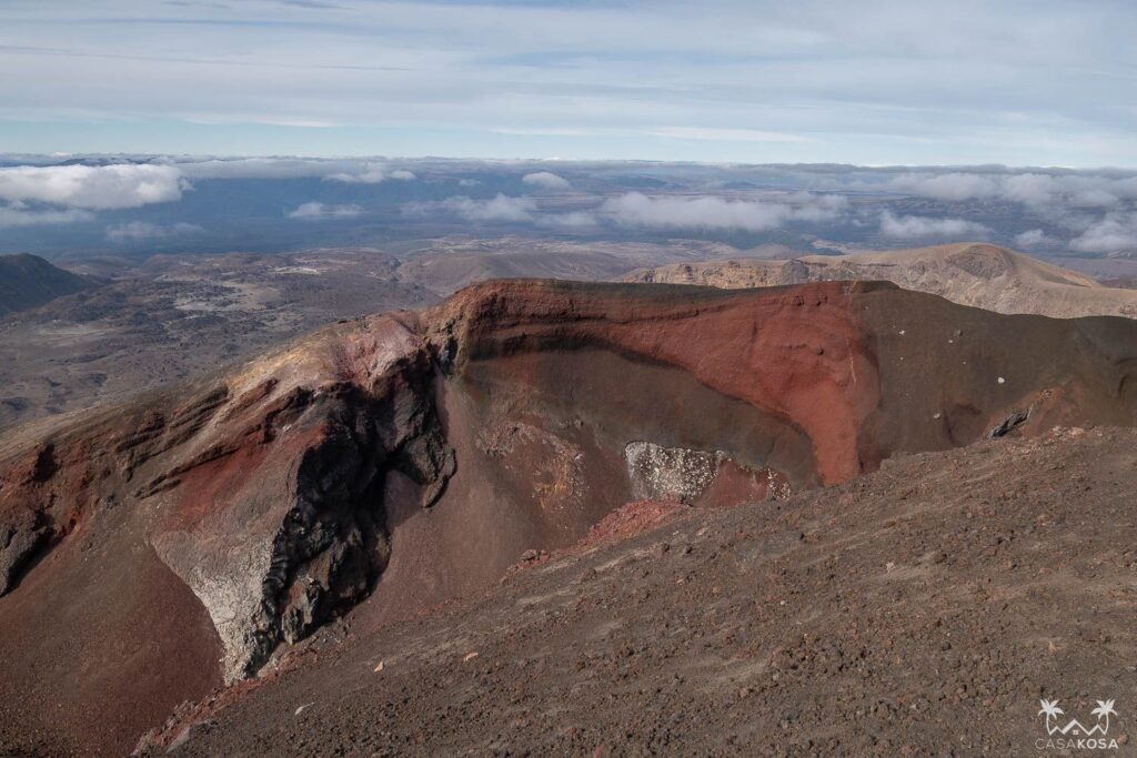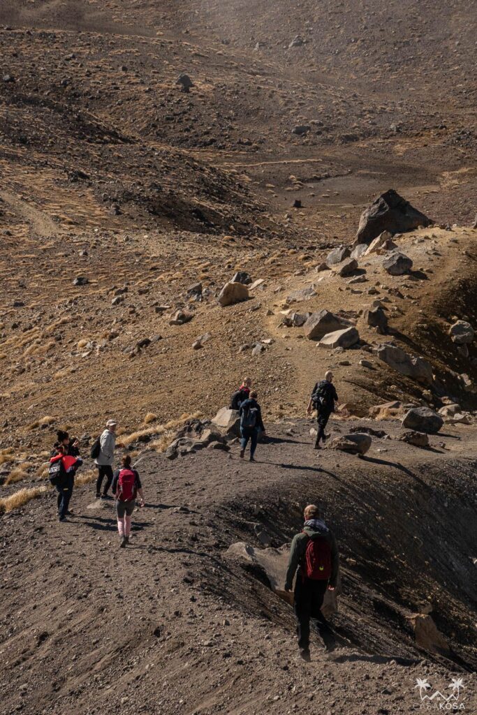 We started super early in the morning from the elevation 1120 m (sign 0 km – and there is one every km to keep you motivated) and started climbing up the Mangatepopo valley following the orange-looking stream. None of the water in the area is drinkable as it contains a plethora of funny volcanic chemicals that would make you pretty sick. We made a short side trip to Soda Springs (again, soda = drinkable, Soda Springs = nope) and after a 10 min stop and chat with our fellow hikers we continued on a steep way up to the saddle between Mount Ngauruhoe and Tongariro and to the South Crater. Some more steps up and we reached the highest point of the track – the Red Crater (1886m) and its sulfur smell.