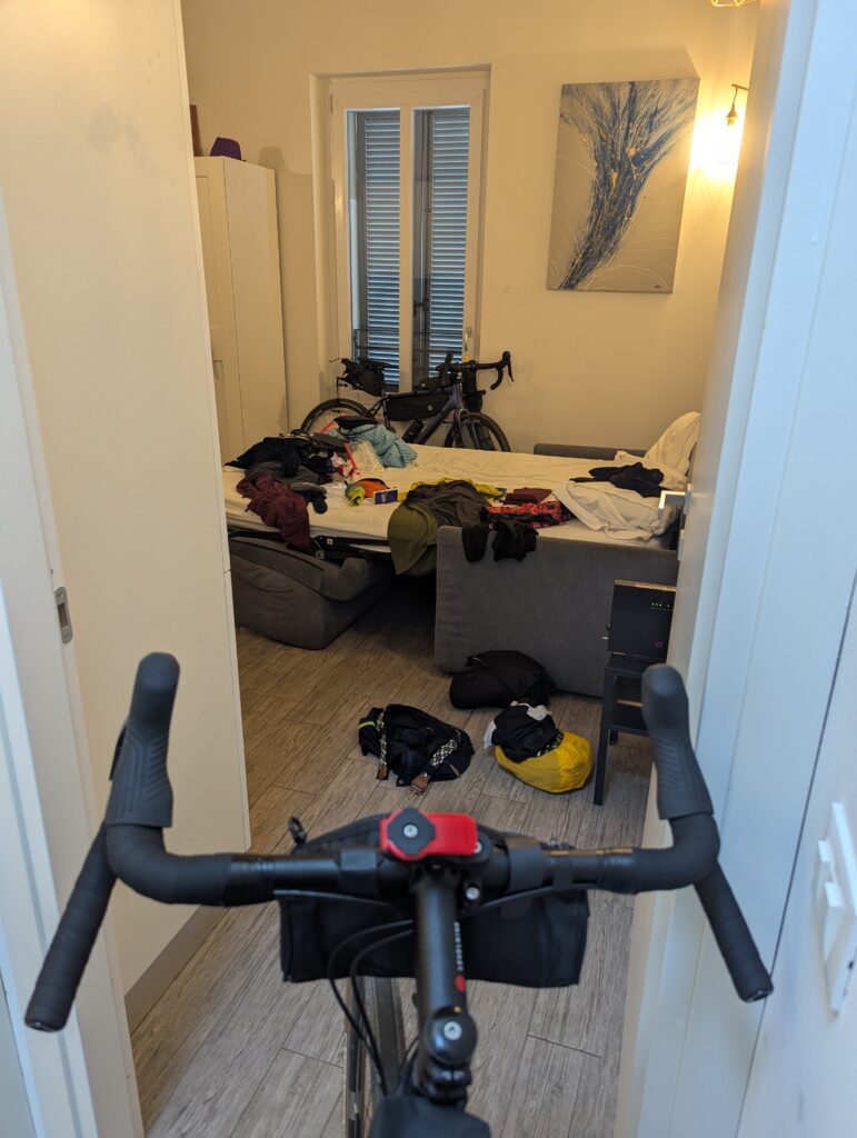 Vlakom na 3 prestupy a málo spánku sa dostaneme do Milána. Dalo by sa na 1 prestup a viac spánku, ale to bolo o 14 CHF drahšie. Ono totiž, tie švajčiarske sedlá na ceste Zurich Miláno sú dosť vysoko a po zime máme síce silné kvadricepsy a hemstringy, ale mizernú kondičku a hlavne delikátne zadky, takže tie prevýšenia na rozjazd by nás asi zabili. A koho zabije prvý deň, ten nemôže trpieť dalšie týždne, a o to tu predsa ide.