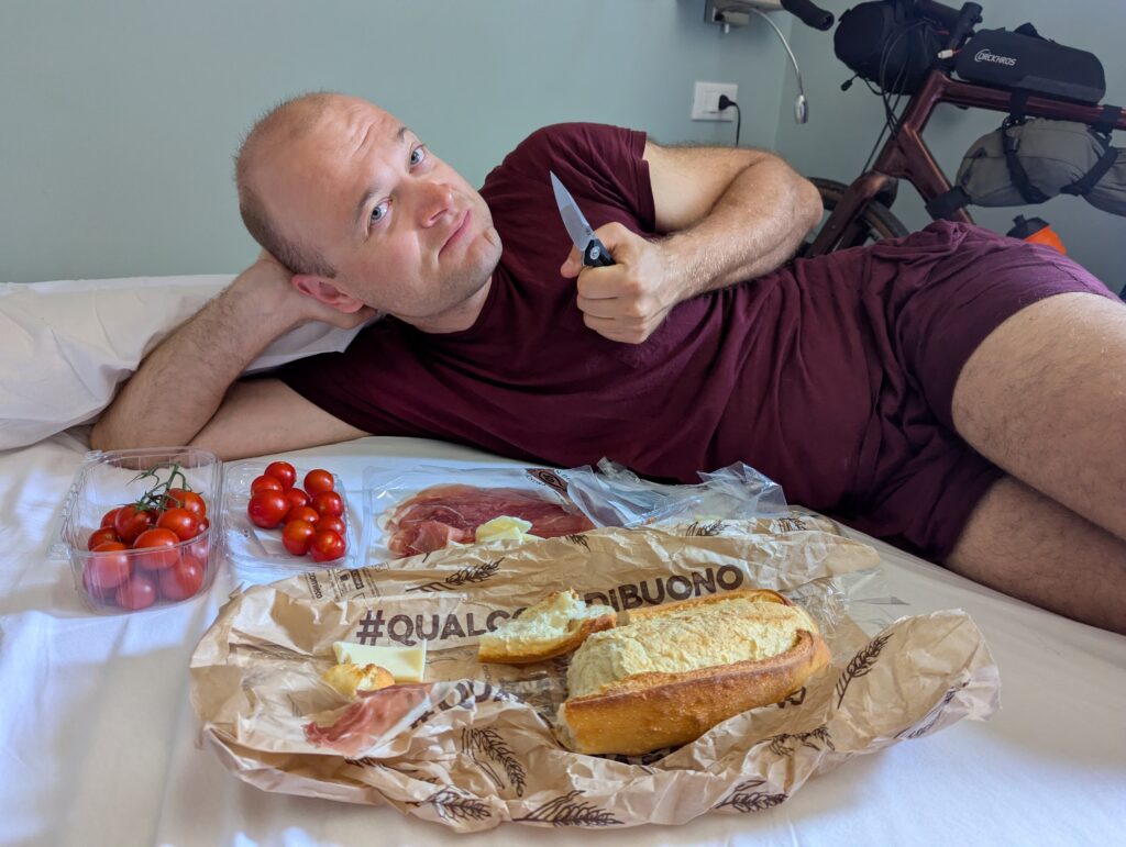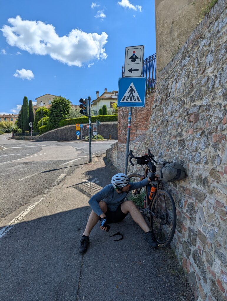 Napchať si brucho pred hlavným kopcom dňa nie je najlepší nápad. Ono, treba síce energiu, ale ako sledovatelia Giro d’Italia vedia, energia má byť z gelíkov a nie krabica hummusu, chleba, syr provolone a rajčiny. Celé toto jazdenie na bajkoch je jedno veľké balancovacie cvičenie – a teraz nemyslím len ľavopravý balans, nech človek nedzigne na stranu tak, ako to vidieť na smiešnych IG videjkách, kde cestní cyklobráškovia na semafore pozabudnú, že majú zaklipávacie pedále a privodia si odreniny a posmech.