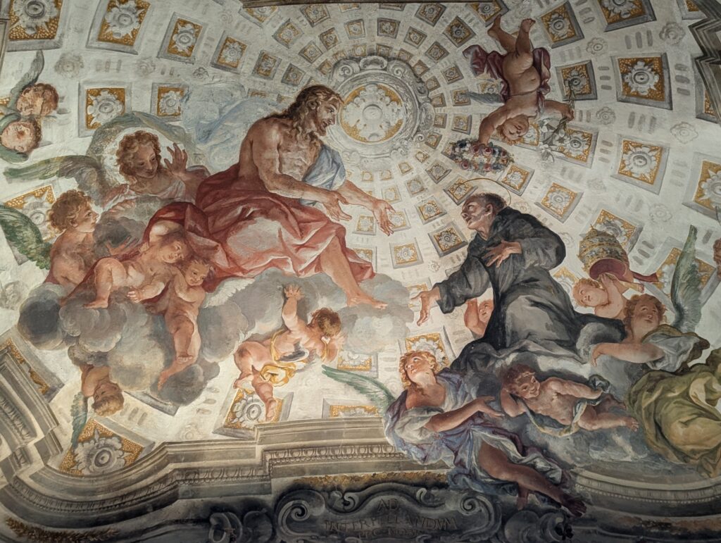 Jediní “pútnici”, čo stretávame, sú dáki angláni, ktorých dakde vykotil autobus a potom si chvíľočku pokráčajú do najbližšieho baru, kde sa nalejú pivom a aperolom. Keby si my dáme pri tom teple a šliapaní kopcov ešte alkáčiky, asi by sme skončili v jarku.