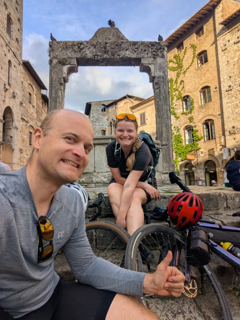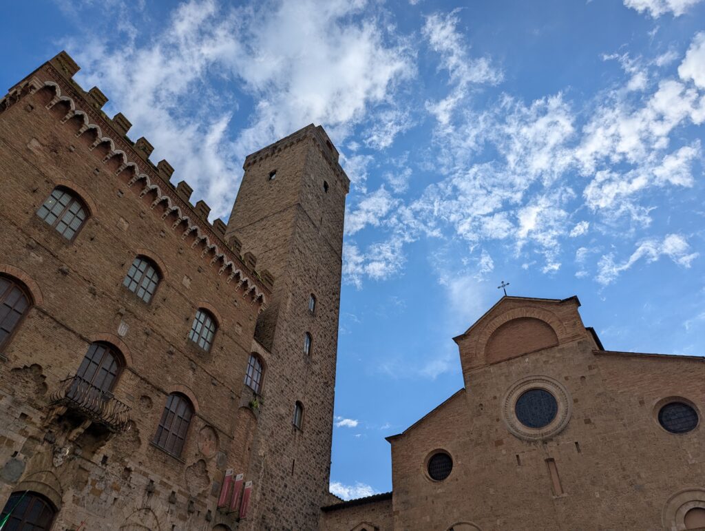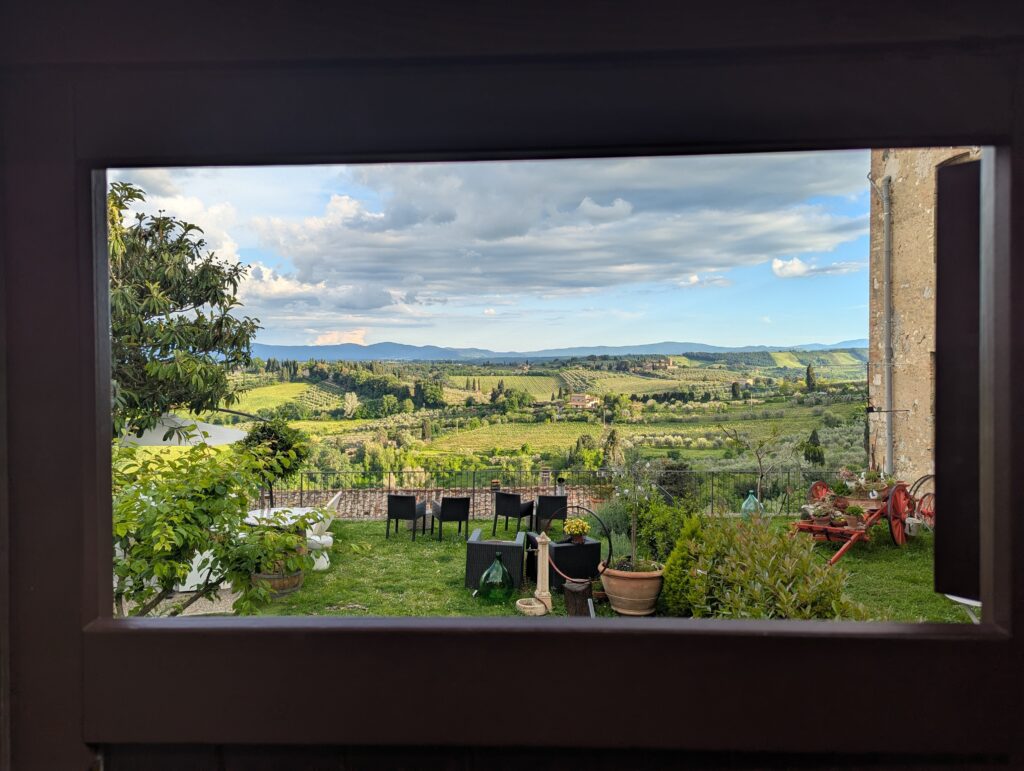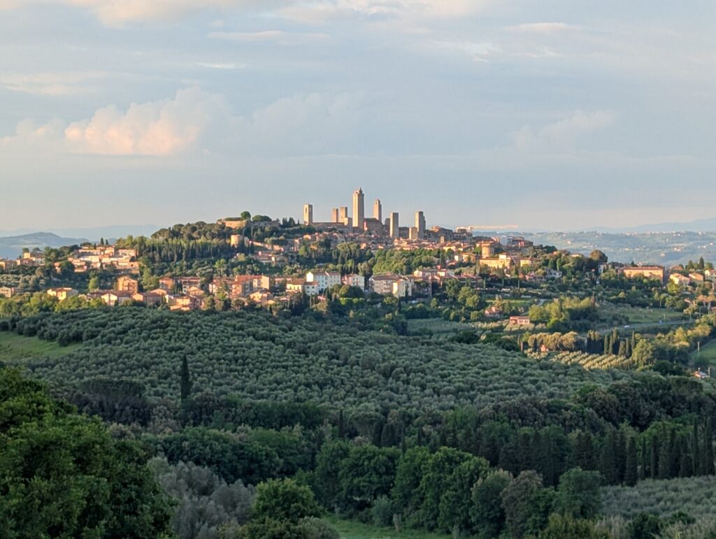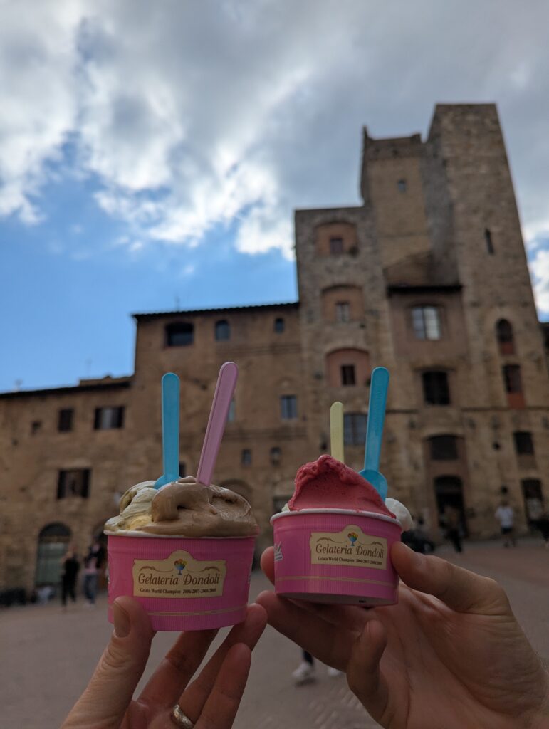 Highlight dňa je San Gimignano. Tu sme boli pred x rokmi s rodinou a fotka od fontány nám pyšne zdobí obývačku. Na hlavnom námestí sú 2 zmrzlinárne, ktoré sa hrdia, že majú najlepšiu zmrzlinu na svete. Ťažko povedať, ideme do tej, kde je dlhší rad a lepší Google map rating. Je dobrá, ale asi sme už v 🇮🇹 mali lepšiu.
