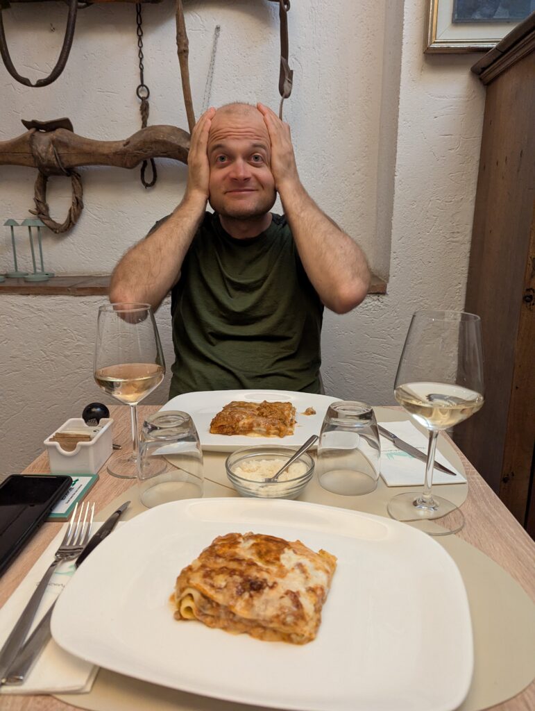 Nakoniec ho ukecáme, že sme na bajkoch, že určite naspäť do San Gimignano nepôjdeme, že si radšej sadneme a počkáme, jak to tí dvaja tragédi v kuchyni zvládnu. Nevýhoda otvorených kuchýň je, že hostia vidia, ako málo kuchári robia a ako im to nejde. Gabriel súhlasí. Po polhodine príde, že teda ak chceme NIEČO, mohlo by to byť lasagne alebo cestoviny s pestom, že to bude rýchle a to kuchári zvládnu. Berieme lasagne.