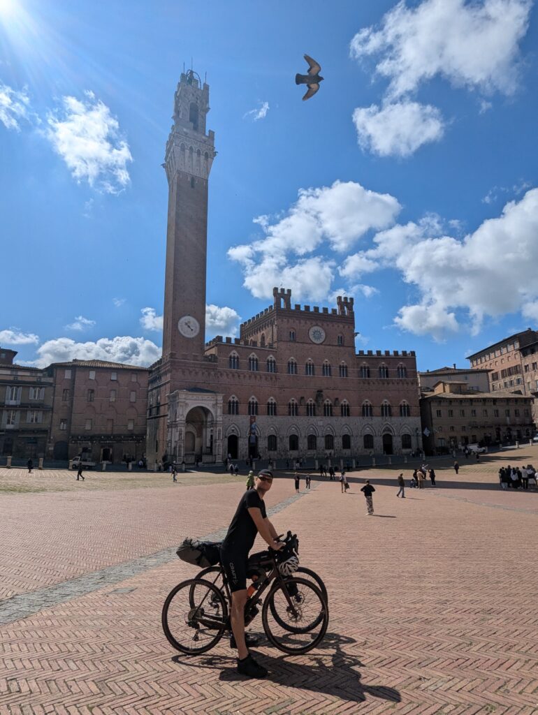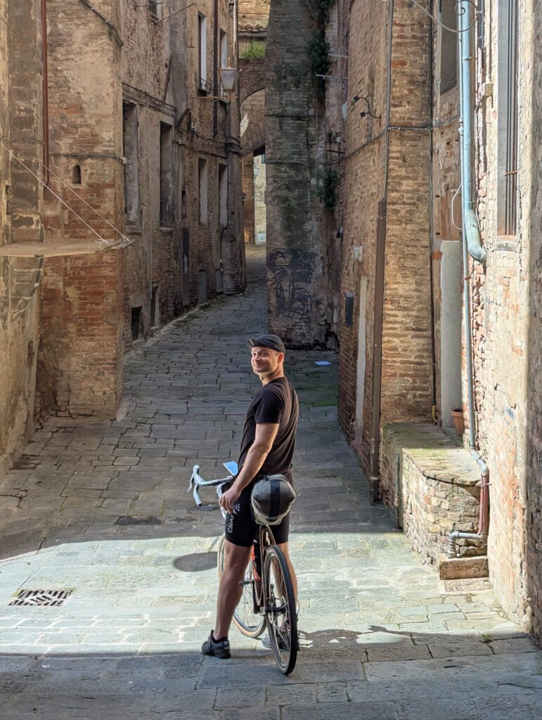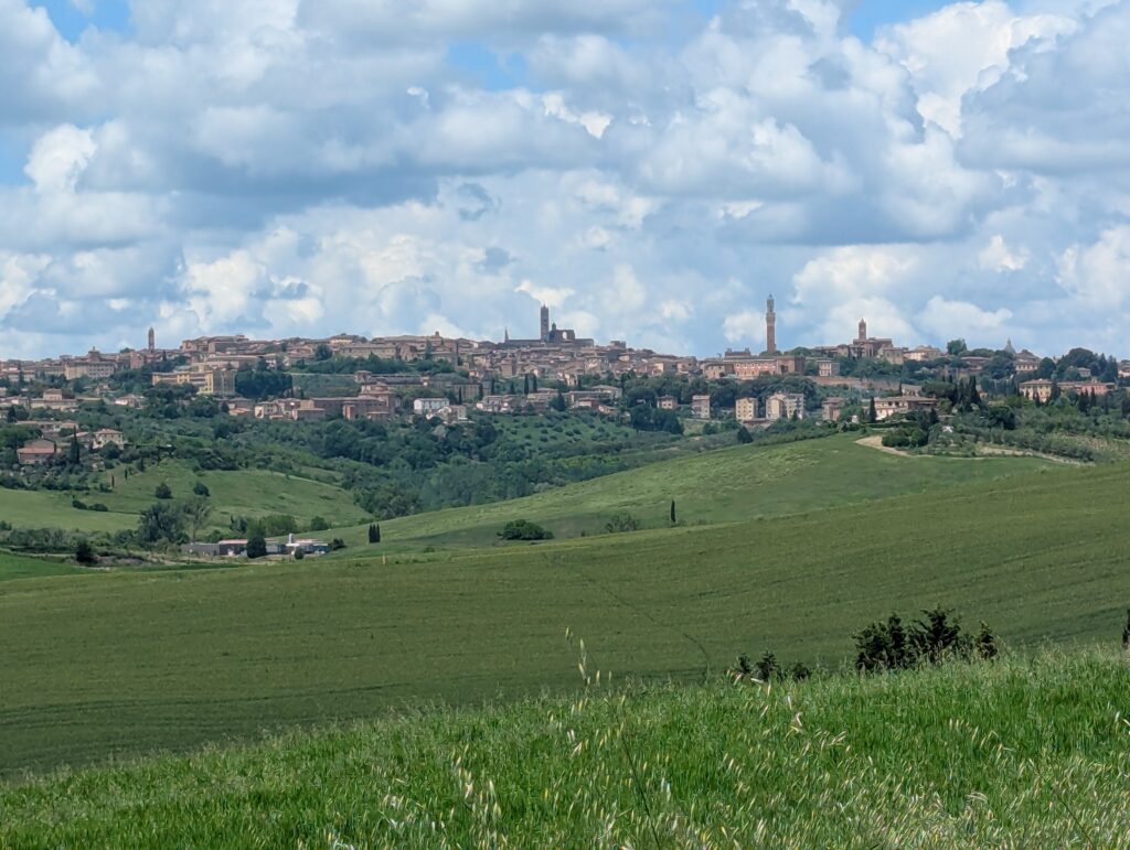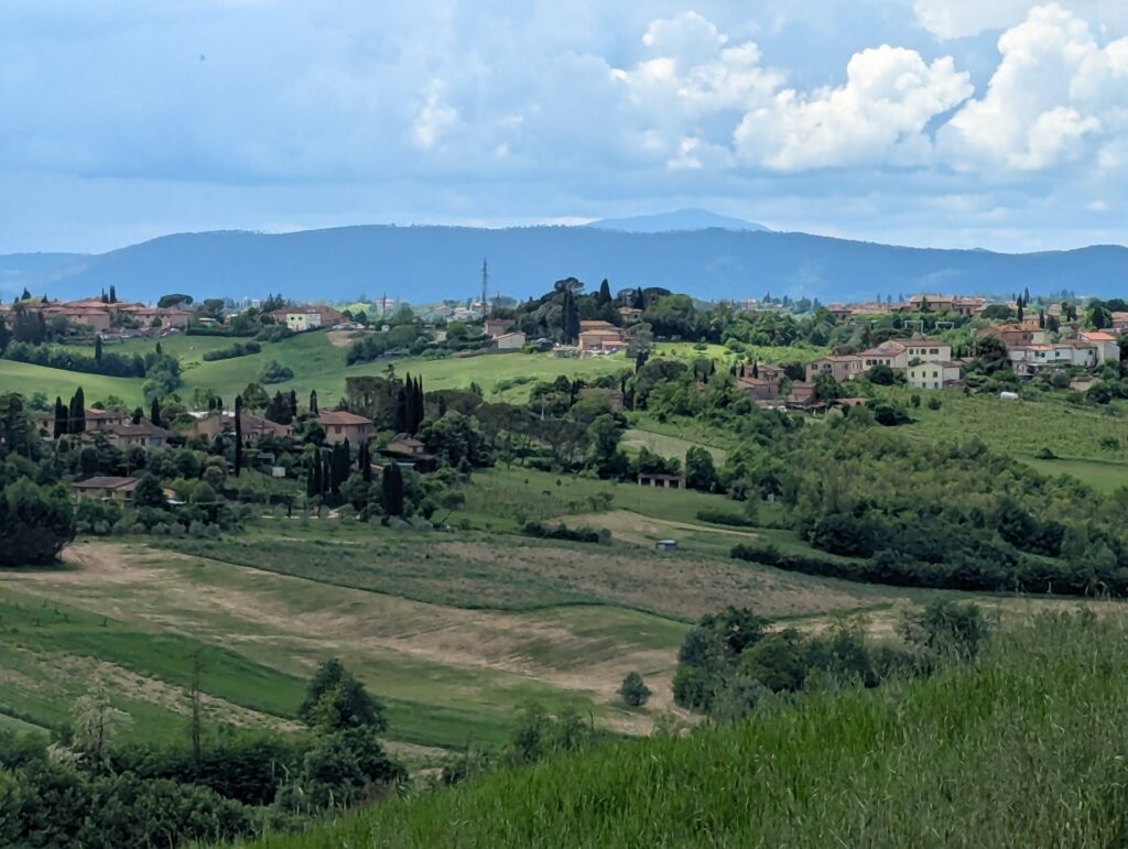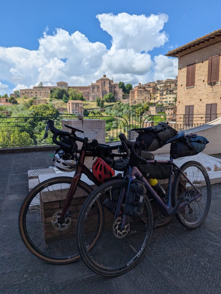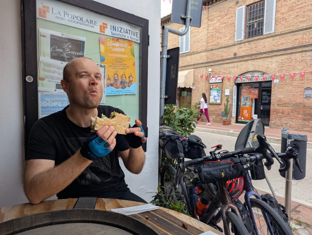 Po ceste z mesta dokúpime cukor, ale nepredávajú tam kávu, takže ideme ešte do ďalšej kaviarne, kde rovno konzumujeme cukor a … No, long story short, pohýňame sa asi o 13. Všetko je pekné, stojíme veľa a pozeráme na spätné výhľady na Sienu. Prvá dlhšia zastávka je Monteroni d’Arbia, kde sme chceli kúpiť nové sedadlo v bike shope, ktorý som našiel na stránke Selle Italia. Lebo už sme na ceste 10 dní a stále si naše rite nezvykli na tieto sedadlá, zatiaľ čo na iných bajkoch máme SI a pohoda. Každopádne, obchod má obednú pauzu od 13 do 1530, čo je síce približne tak dlho, ako aj mne vyhovuje, ale v aktuálnej situácii je to škrt cez rozpočet.