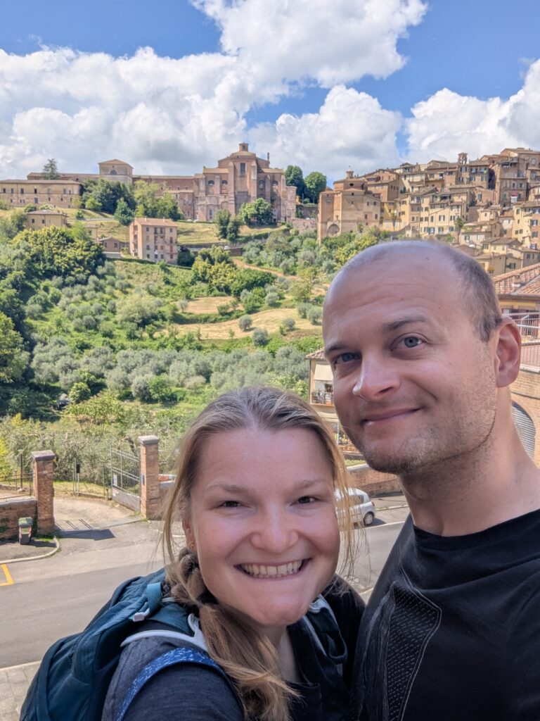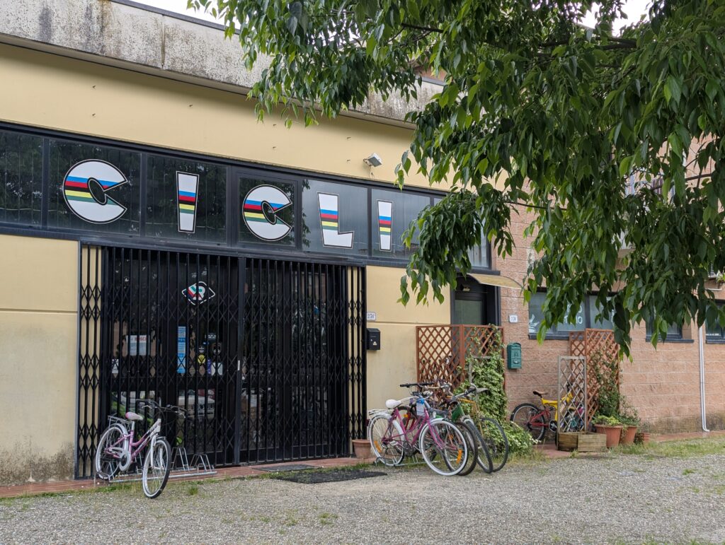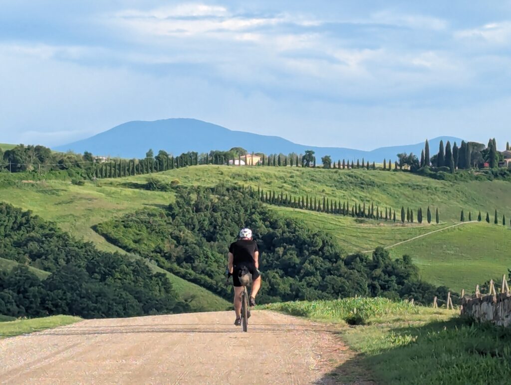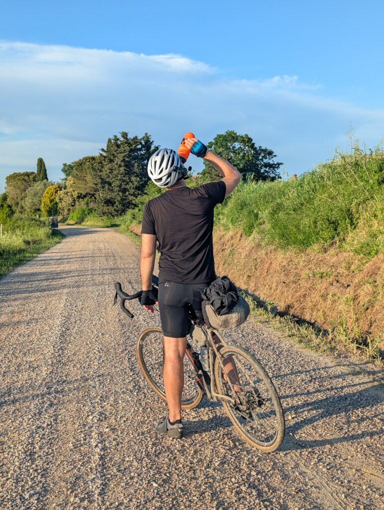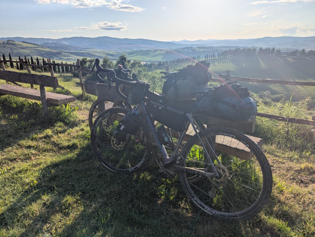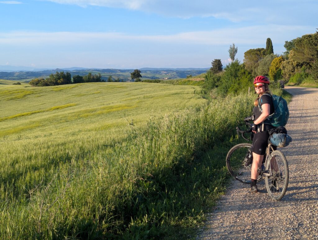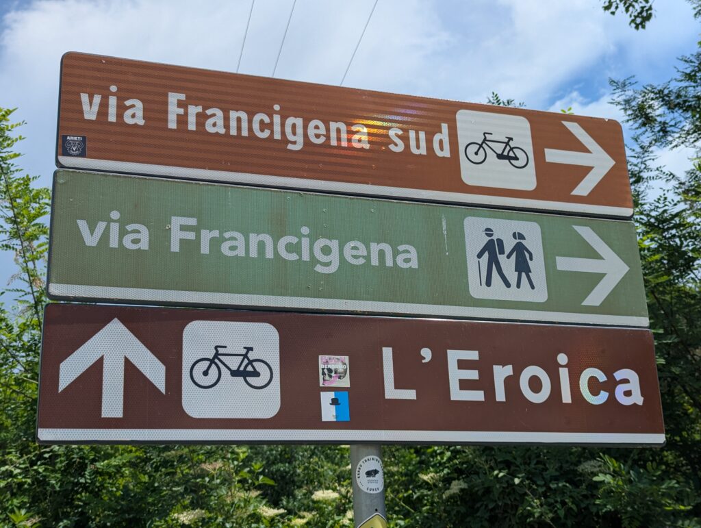 Po ceste z mesta dokúpime cukor, ale nepredávajú tam kávu, takže ideme ešte do ďalšej kaviarne, kde rovno konzumujeme cukor a … No, long story short, pohýňame sa asi o 13. Všetko je pekné, stojíme veľa a pozeráme na spätné výhľady na Sienu. Prvá dlhšia zastávka je Monteroni d’Arbia, kde sme chceli kúpiť nové sedadlo v bike shope, ktorý som našiel na stránke Selle Italia. Lebo už sme na ceste 10 dní a stále si naše rite nezvykli na tieto sedadlá, zatiaľ čo na iných bajkoch máme SI a pohoda. Každopádne, obchod má obednú pauzu od 13 do 1530, čo je síce približne tak dlho, ako aj mne vyhovuje, ale v aktuálnej situácii je to škrt cez rozpočet.
