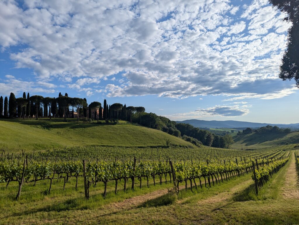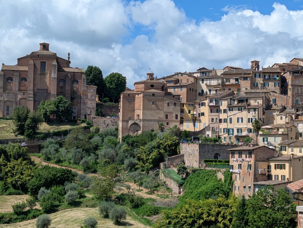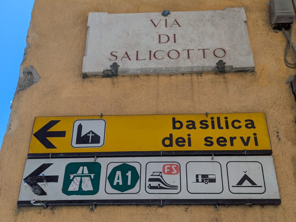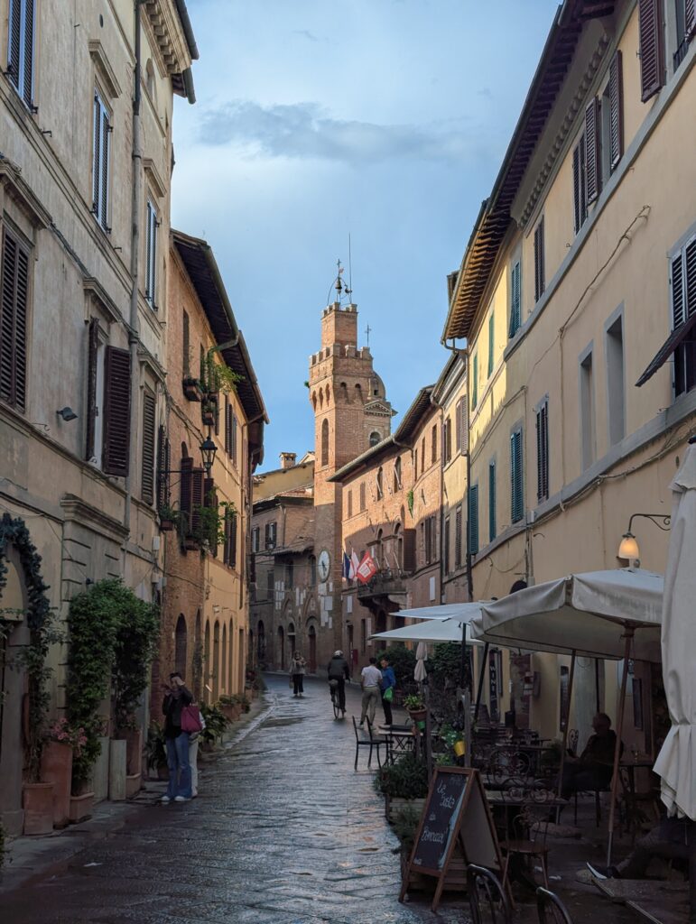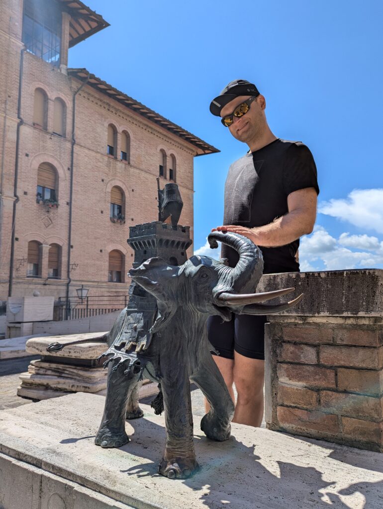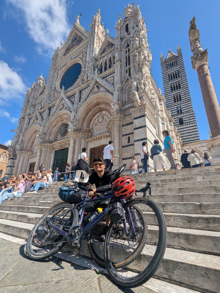 Po ceste z mesta dokúpime cukor, ale nepredávajú tam kávu, takže ideme ešte do ďalšej kaviarne, kde rovno konzumujeme cukor a … No, long story short, pohýňame sa asi o 13. Všetko je pekné, stojíme veľa a pozeráme na spätné výhľady na Sienu. Prvá dlhšia zastávka je Monteroni d’Arbia, kde sme chceli kúpiť nové sedadlo v bike shope, ktorý som našiel na stránke Selle Italia. Lebo už sme na ceste 10 dní a stále si naše rite nezvykli na tieto sedadlá, zatiaľ čo na iných bajkoch máme SI a pohoda. Každopádne, obchod má obednú pauzu od 13 do 1530, čo je síce približne tak dlho, ako aj mne vyhovuje, ale v aktuálnej situácii je to škrt cez rozpočet.