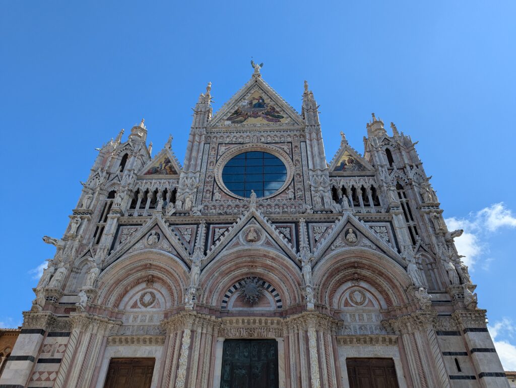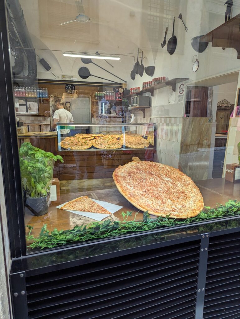 Vymotať sa zo Sieny je podobný problém ako vmotať sa do nej. Strmo hore, strmo dole, kľučkovanie medzi turistami a psími lajnami, jedno lepšie ako druhé. Po ceste stretávame jednu pascičku na turistov za druhou, míňame čokoládové fontány a pizzu s priemerom cez meter, ale keďže smerujeme k hlavnému námestiu, nikde sa nezastavujeme. Lokálne duomo je pôsobivé (čo si nemyslia 2 triedy holandských teenagerov, ktorí znudene sedia na schodoch s nami. Ale na druhej strane, ja ako teenager by som to určite neocenil tiež. Niekto zo spolužiakov by už isto otváral domácu vo fľaši z minerálky a zbytok triedy by ručal po okoloidúcich. Takže po porovnaní so správnym baseline, Holanďania ok).