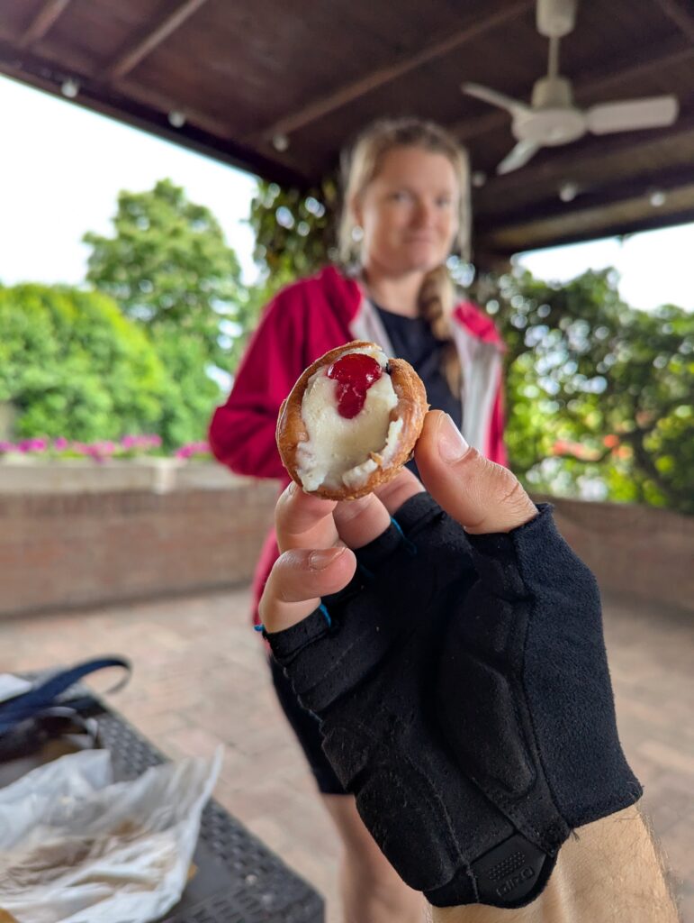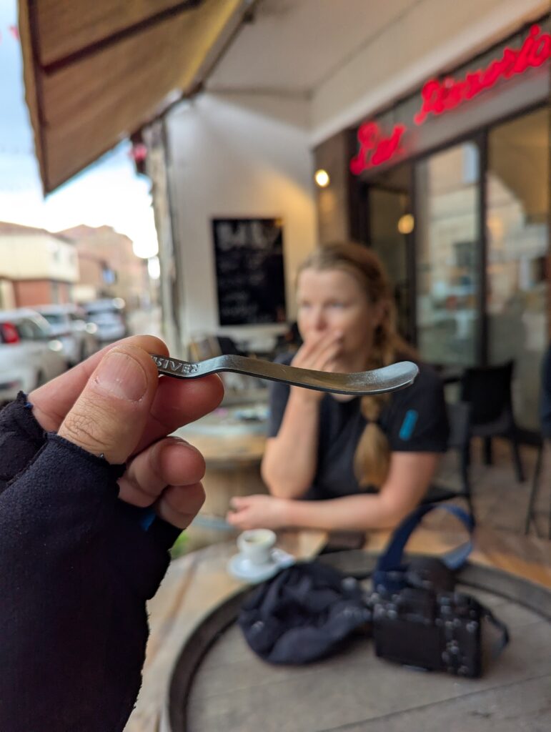 V kuchyni obklopení bajkami a prázdnymi obalmi tlačíme zbytky jedla. Jahodám štrkové cesty neprospievajú, je z nich skoro pyré. Pólka sklenenej fľašky s fancy tuniakovými kúskami, po ktorej mi smrdí predná taška, sa ideálne hodí k vajciam natvrdo ukoristeným z minulých raňajok. Gurmánstvo zakončíme slanými sušienkami, ktoré nosím ako kalorickú zálohu snáď od druhého dňa a kávou z bialetti automatu kopírujúceho Nespresso (zapredanci).