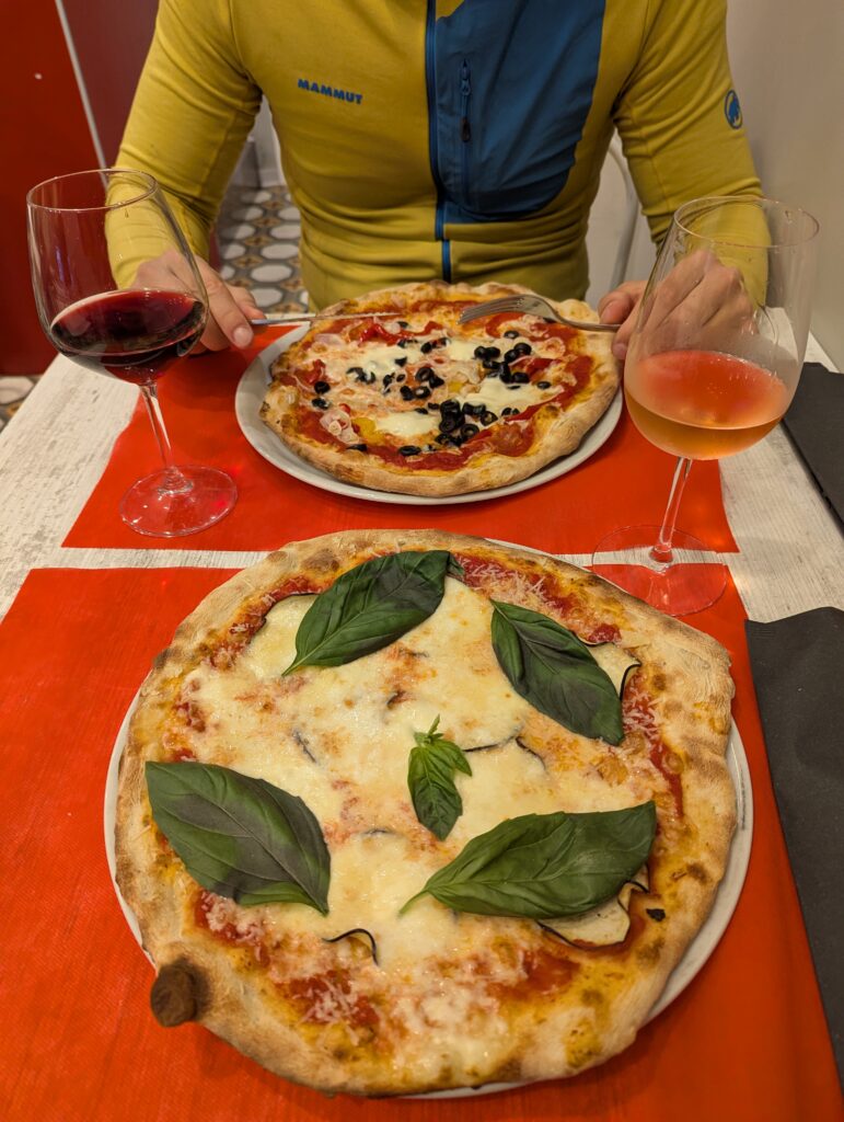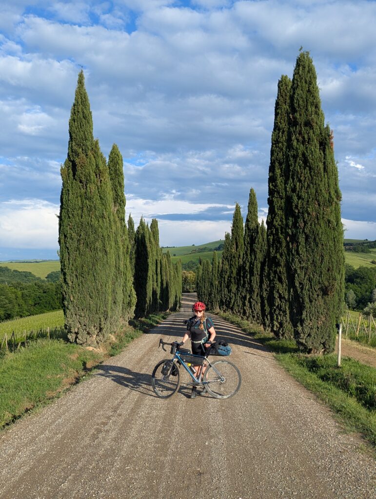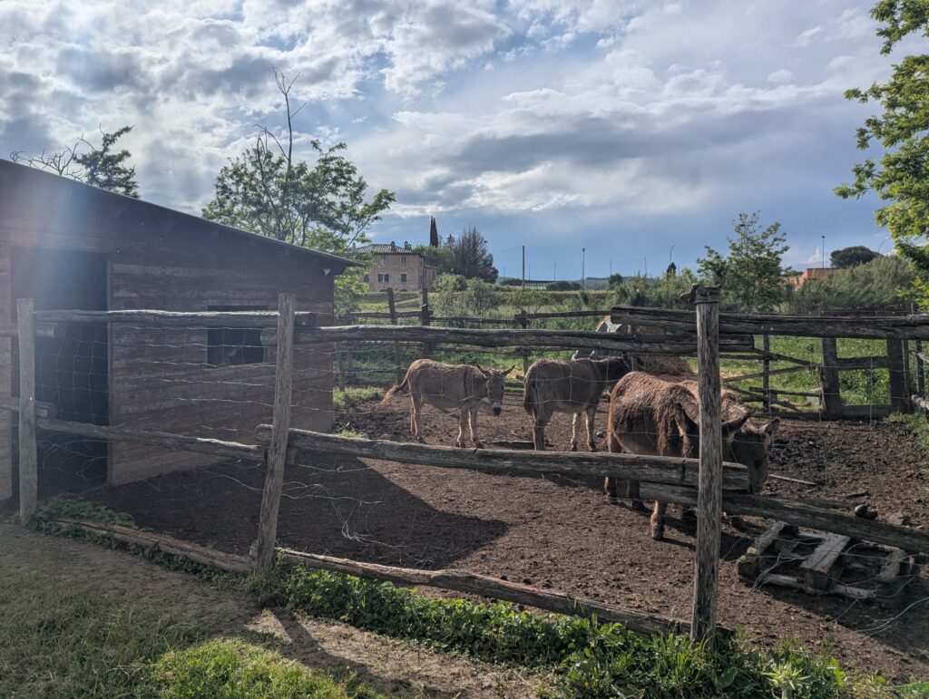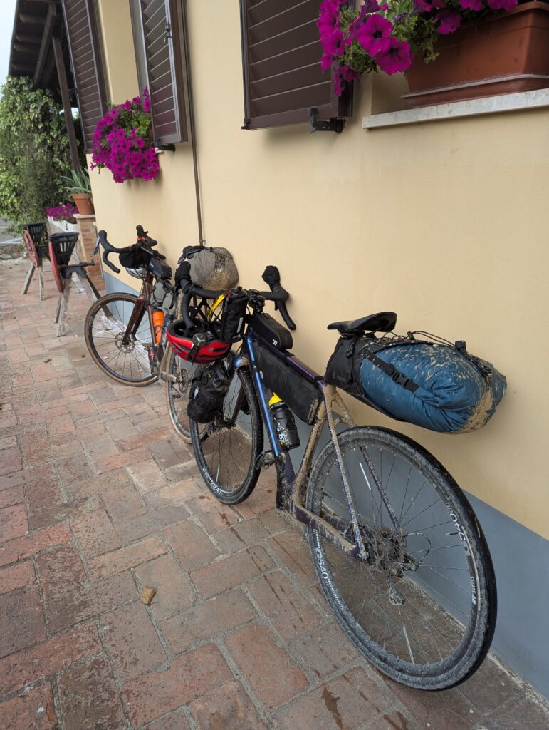 Pohneme sa ďalej cez dedinu, keď tu nás prvé kvapky presvedčia dať si v trattórii, ktorá je zrovna poruke, pauzu na kávu. Po chvíľke nsi prisadnú dve americké cyklistky, ktoré majú menej batožiny a väčšie povedomie o svojich schopnostiach (aj keď majú rovnakú destináciu ako my). Nakoniec tu sedíme asi hodinu, lebo leje jak z krhly, a ku káve doobjednávame ešte sendviče a ruskú zmrzlinu. Dnešná etapa je bohatá na štrkové cesty, ktoré sú bohaté na mláky a blato a bordel, podľa čoho my aj bajky vypadáme. Správne hádame, že nás v tomto stave nepustia s bajkami na ubytko – ono, do tej izby 11m² by sa moc aj tak nezmestili, keďže v nej už je posteľ.