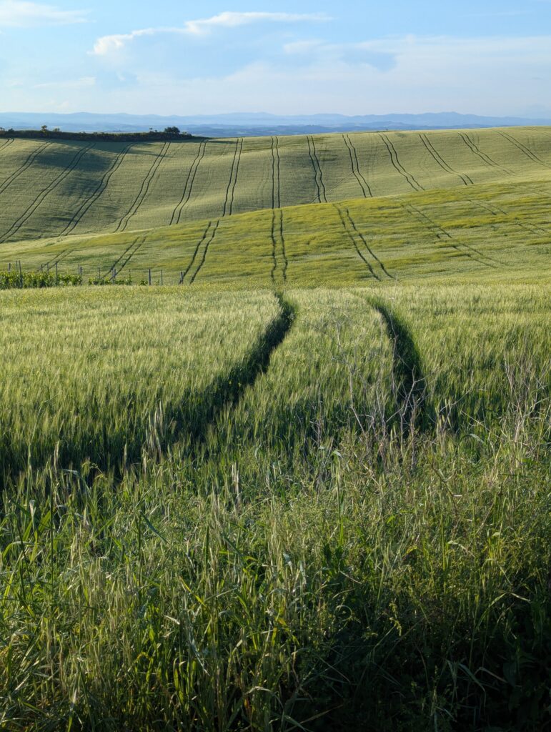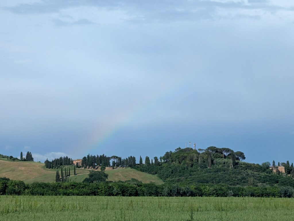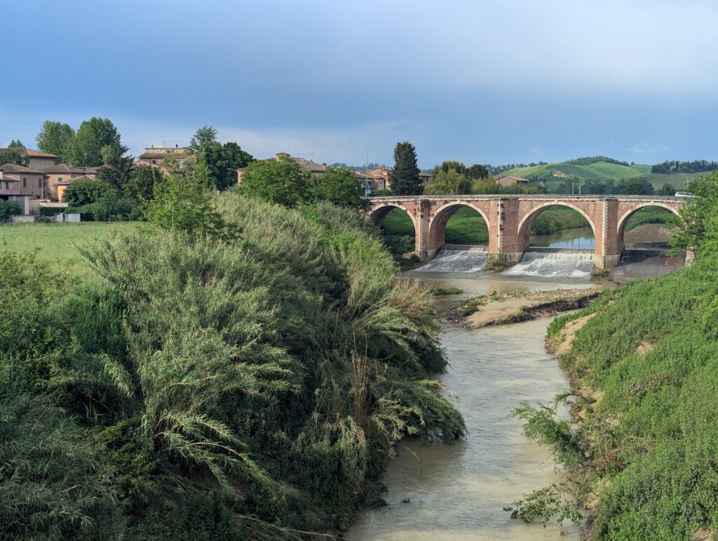 Prelezieme ďalší kopček a sme v Ponte d’Arbia. Pozorný čitateľ vydedukoval, že idem dolinou riečky Arbia. My v tomto okamihu príbehu dedukujeme, že je čas sa znova schovať dakde na kávu, lebo čo? Prší. Čo čert nechcel, hneď na začiatku dediny sa naskytne reštaurácia. Čo čert chcel, je zavretá. Toto slovné spojenie s čertom nedáva moc význam, nie? Druhá reštaurácia v dedine je otvorená, ale v tomto stave počasia príliš ďaleko. Čakáme ďalšiu hodinu. Zjeme väčšinu cukru zo Sieny. Oblečieme všetko nepremokavé čo máme – vyrážame cez most smer Buonconvento. Po pol kilometri prestáva pršať. Vyzliekame nepremokavé veci. Tragikomické. Toto čert chcel?
