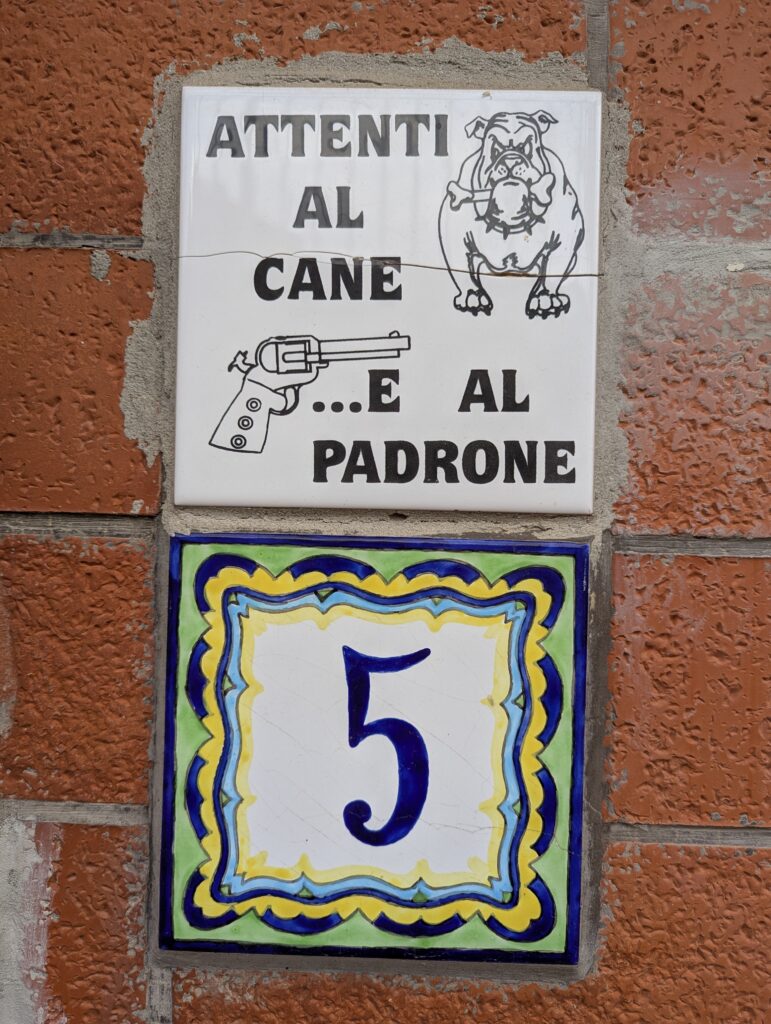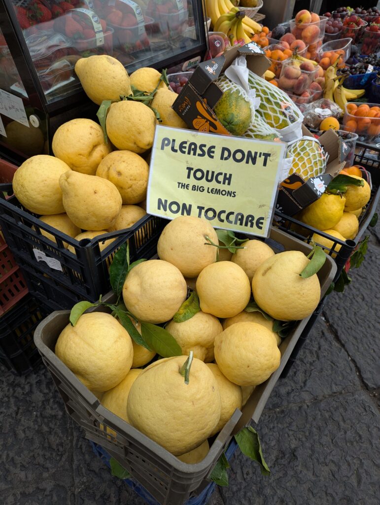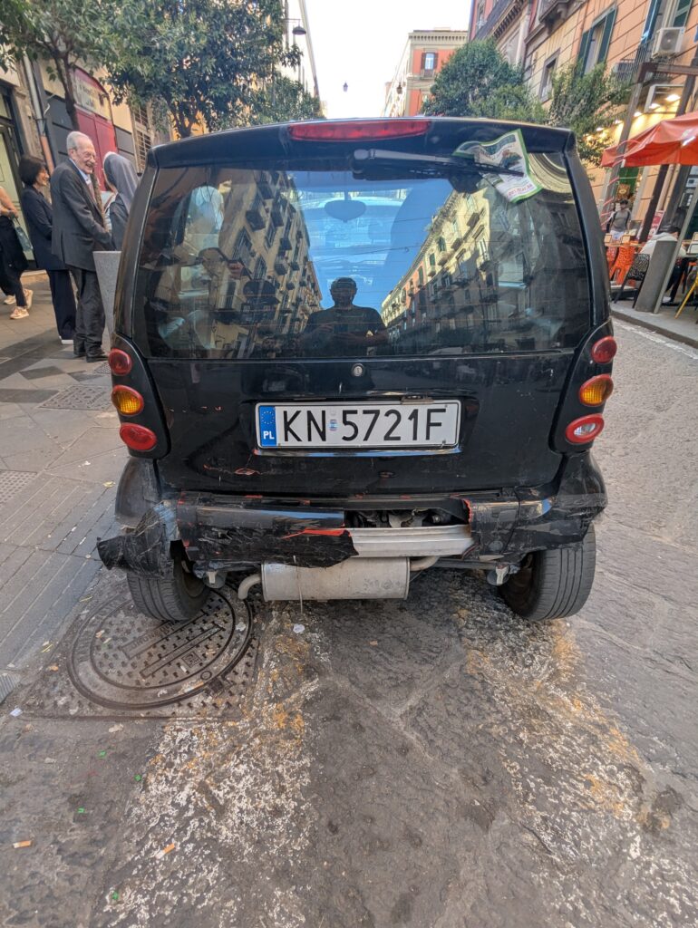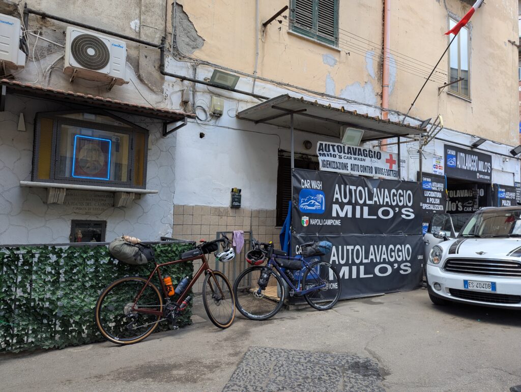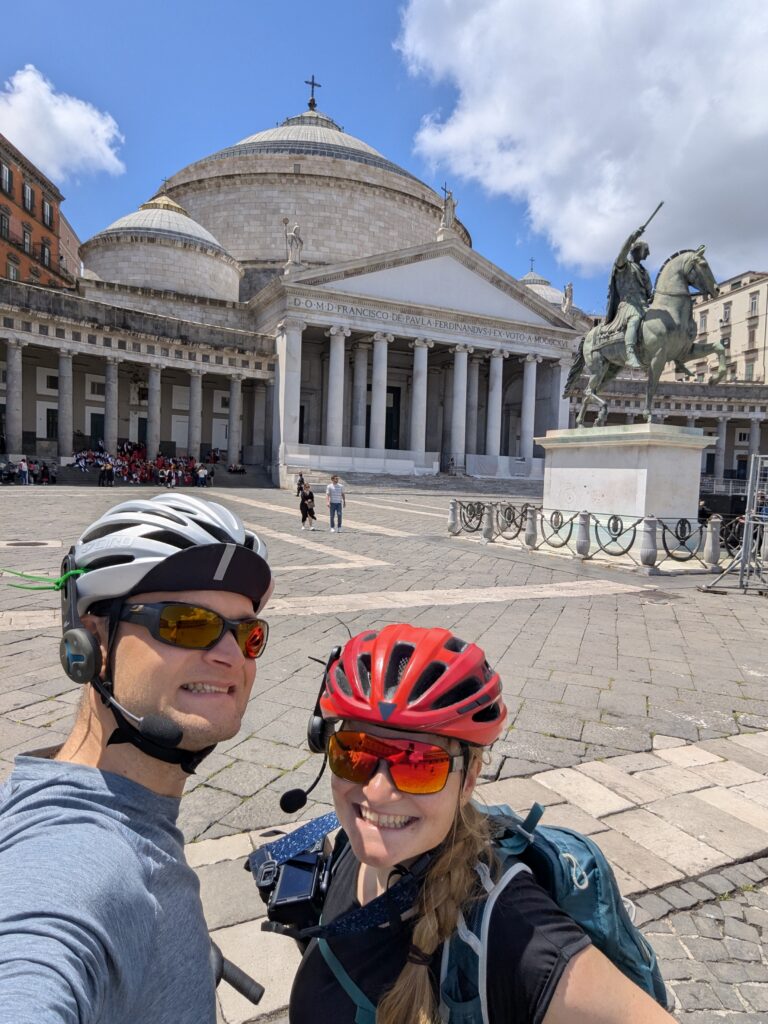Doprava je tu o dosť väčší chaos ako kdekoľvek inde v Taliansku. Verím, že keby začneme tu a chceme ísť na sever, asi by bol prílišný šok – takto sme ale mentálne naladení na talianske spôsoby a jazdíme pomaly otrlejšie ako talianski motoristi. Jednosmerky sú odporúčania, stredové čiary sú návrhy, červené na semafore nám hovoria “poriadne sa pozri na obe strany, ale moc to nerieš”. Keď sa takto človek naladí, je tu pohyb na bajku ale celkom efektívny a necítili sme sa ani moc nebezpečne (nie že by na nás nikto netrúbil, ale priemerný vodič tu trúbi raz za minútu).