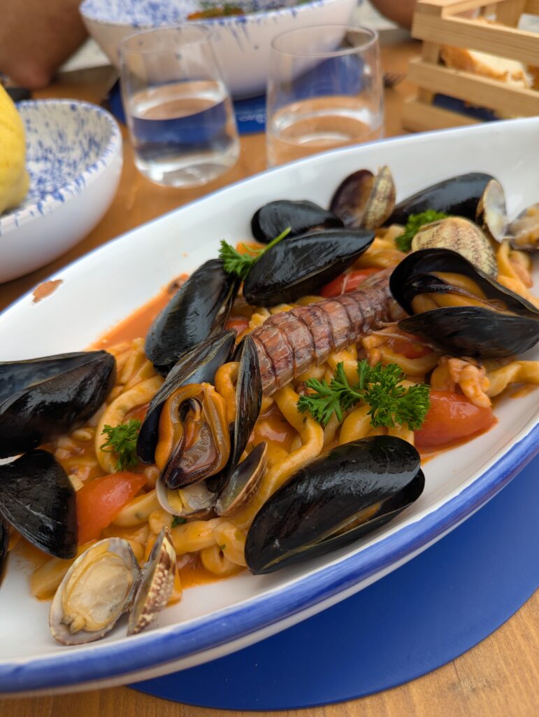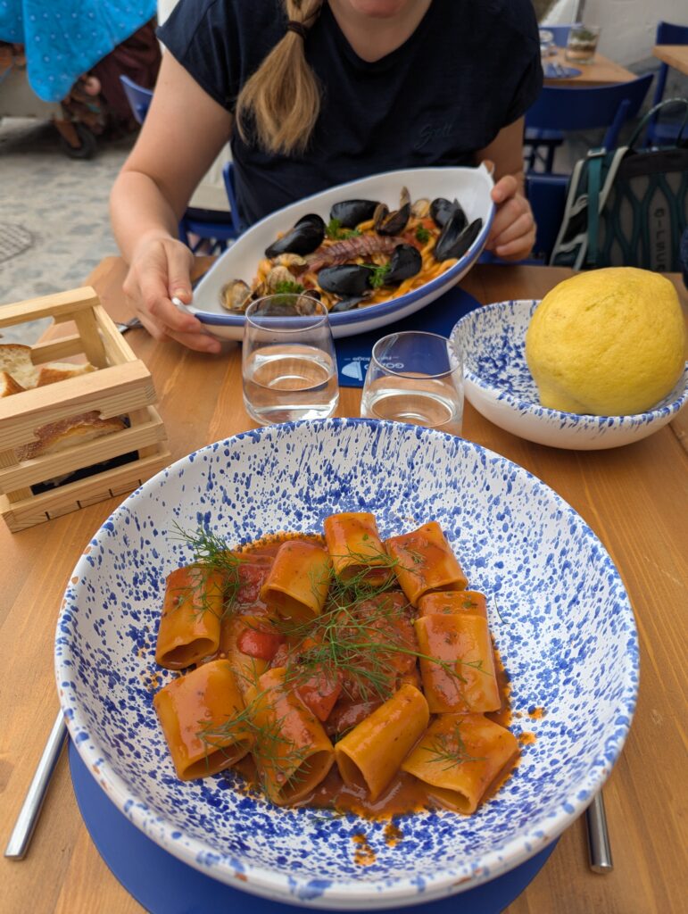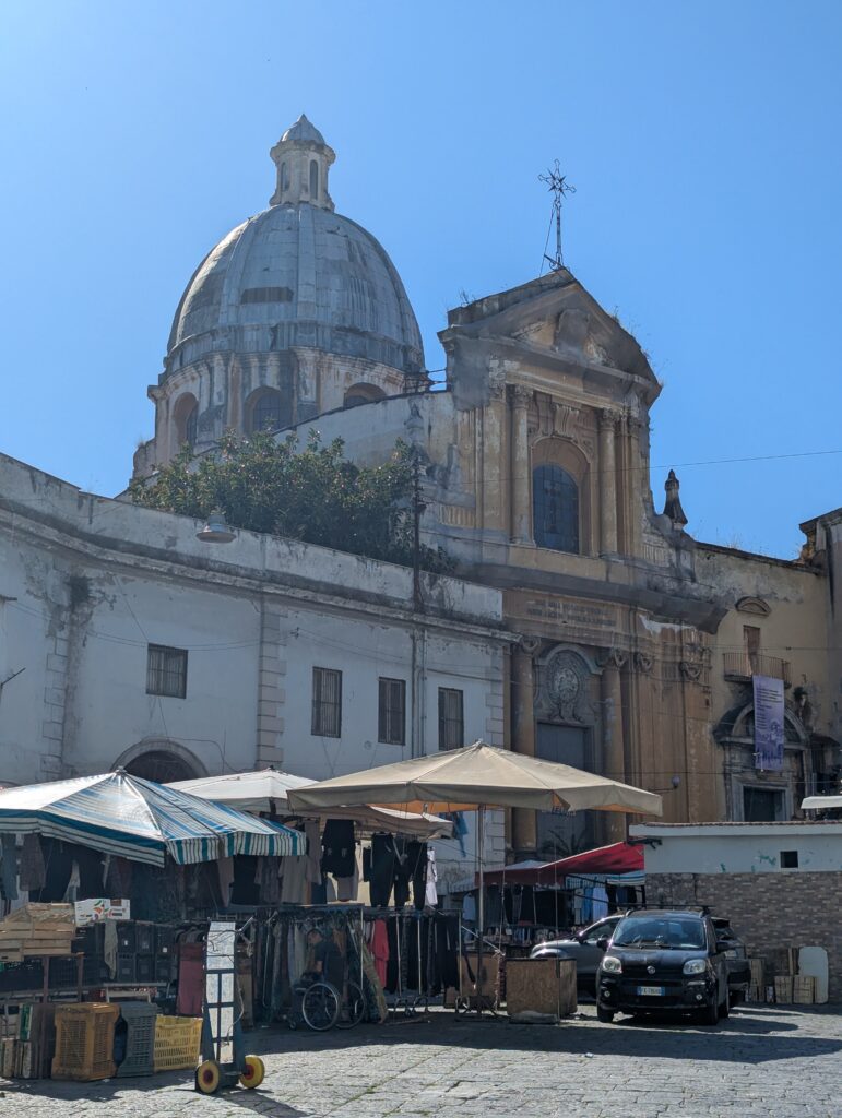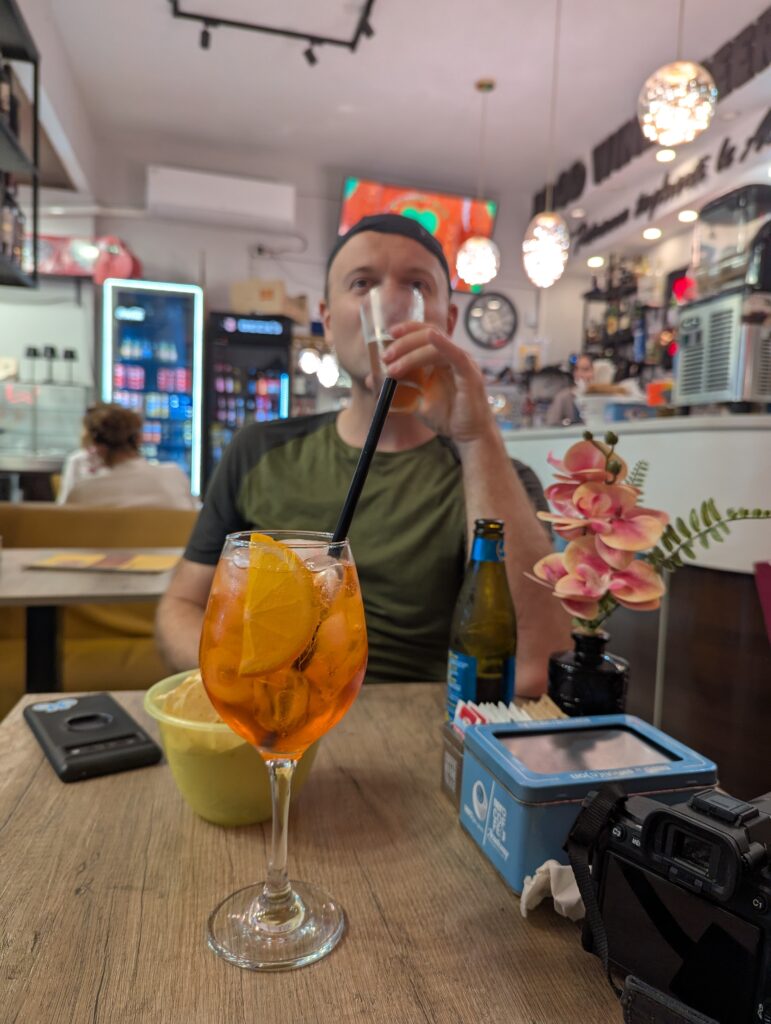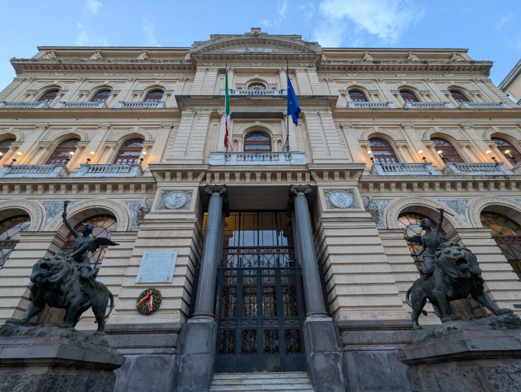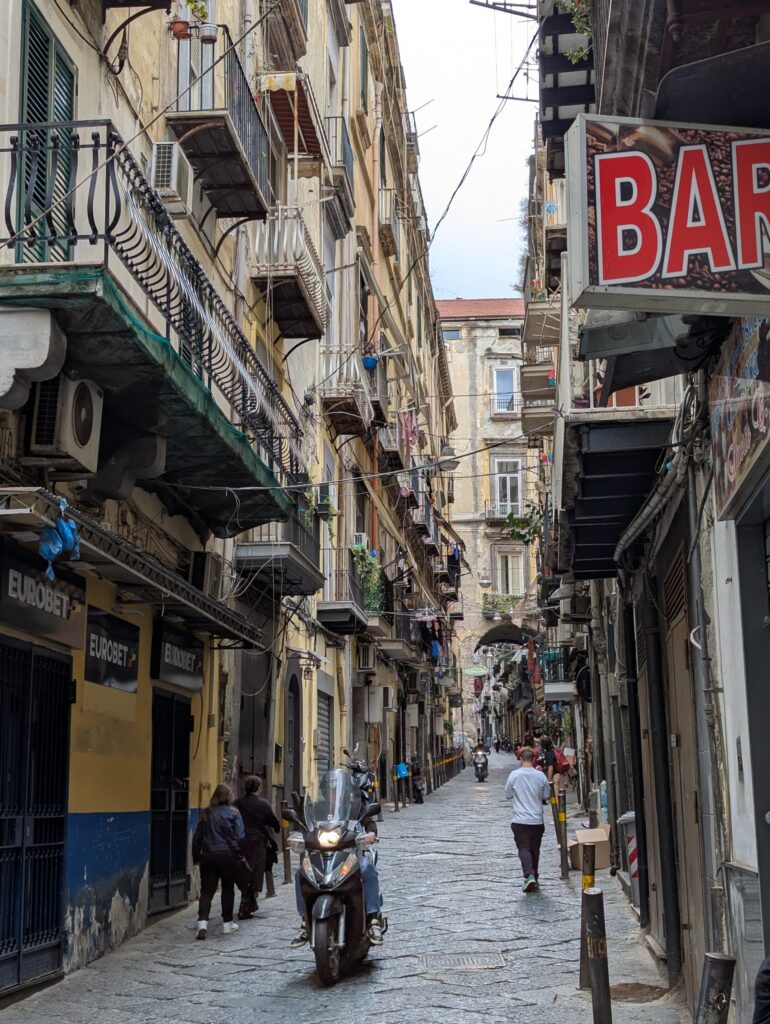 Doprava je tu o dosť väčší chaos ako kdekoľvek inde v Taliansku. Verím, že keby začneme tu a chceme ísť na sever, asi by bol prílišný šok – takto sme ale mentálne naladení na talianske spôsoby a jazdíme pomaly otrlejšie ako talianski motoristi. Jednosmerky sú odporúčania, stredové čiary sú návrhy, červené na semafore nám hovoria “poriadne sa pozri na obe strany, ale moc to nerieš”. Keď sa takto človek naladí, je tu pohyb na bajku ale celkom efektívny a necítili sme sa ani moc nebezpečne (nie že by na nás nikto netrúbil, ale priemerný vodič tu trúbi raz za minútu).