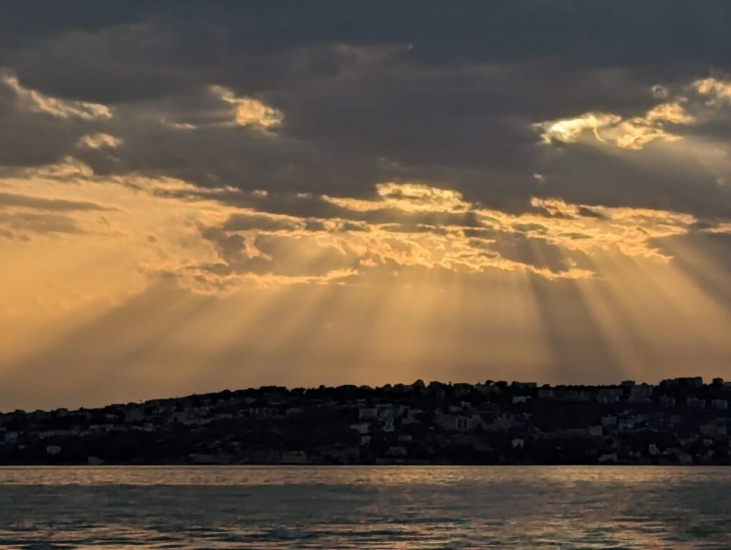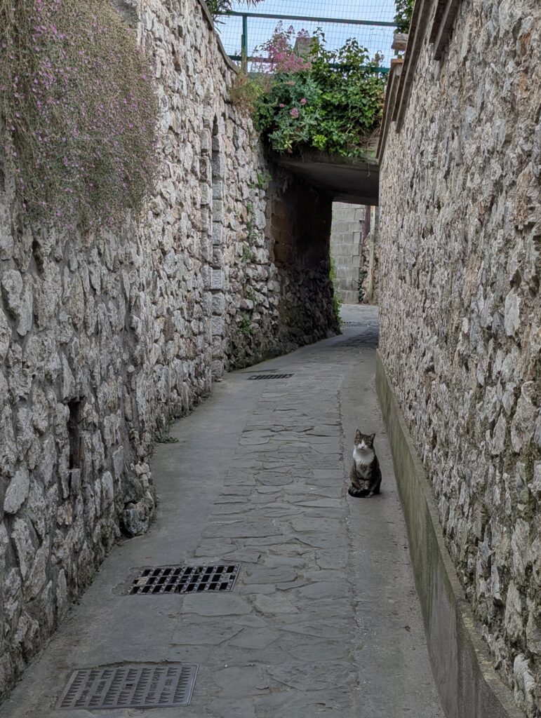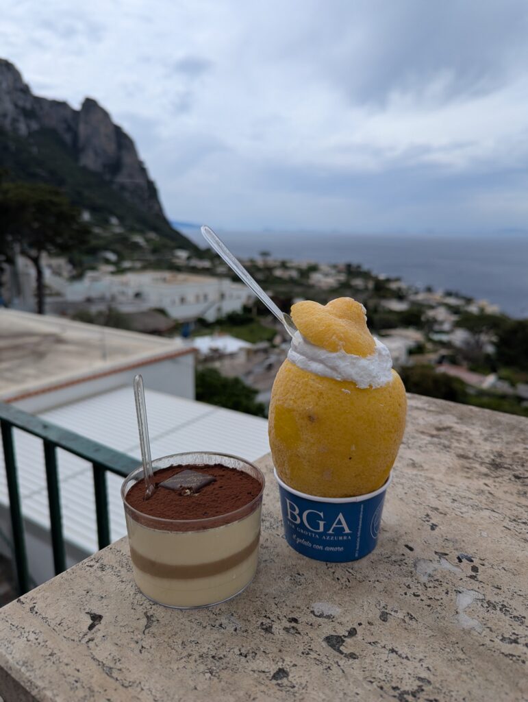Dávame si citrónový sorbet natlačený v zamrznutom citróne a tiramisu, dokopy 14 eur. Vraj dobrá cena na tento (blbý, turistický, nadhodnotený) ostrov. Oproti tomuto je “masový” turizmus v JV Ázii úplne tichá meditácia v horskej jaskyni obklopený zvieratkami jak Budha. Každopádne, chvíľu sa motáme hore dole, potom chceme ísť do botanickej záhrady, ale zláka nás Via Krupp, ktorá je zadarmo, a tá nás dovedie z vrchu ostrova až k moru, takže sa nám už do záhrady nechce.