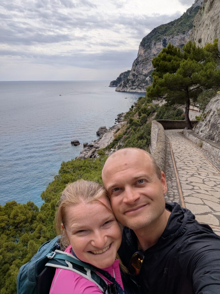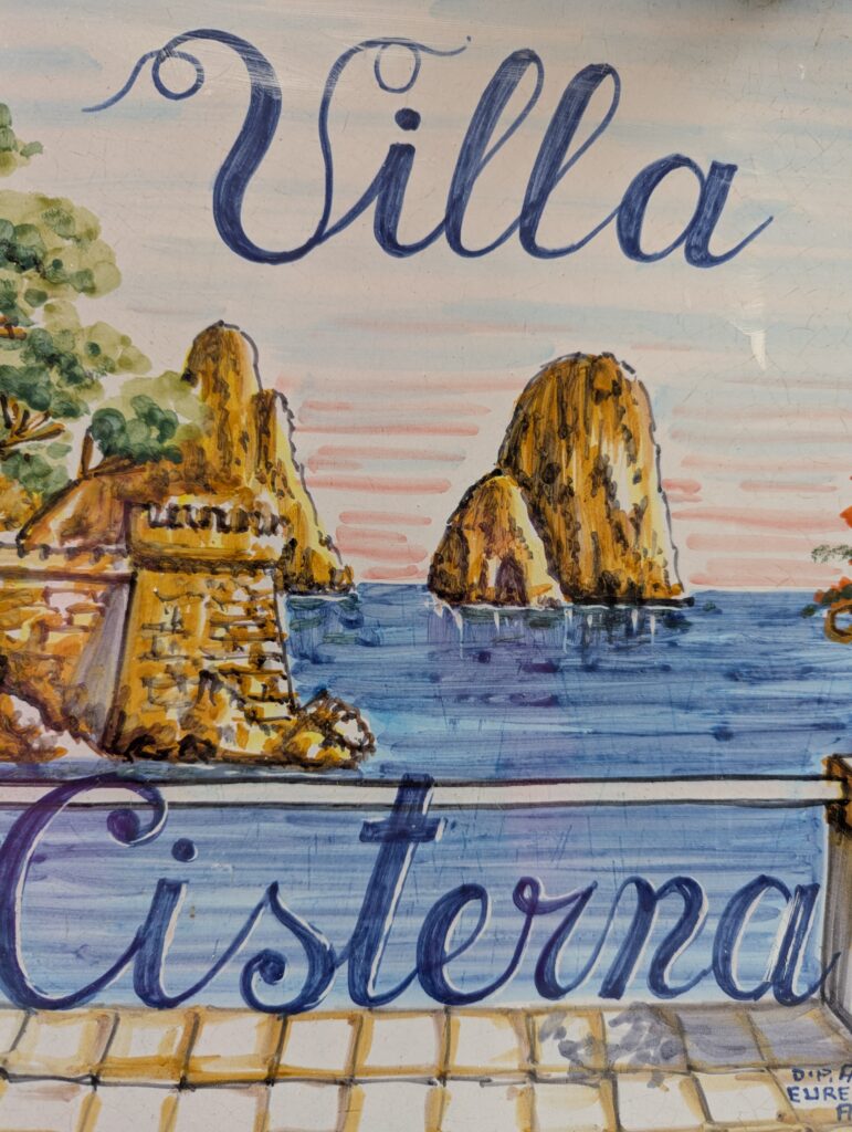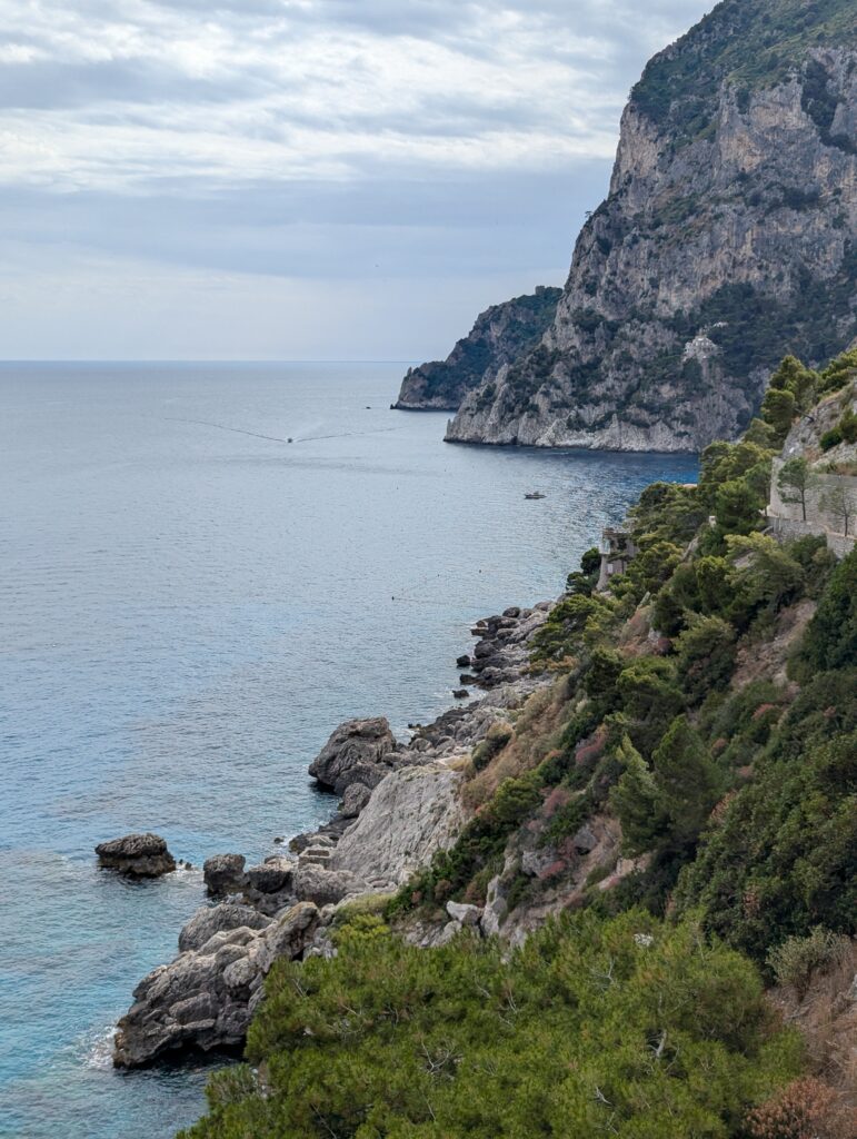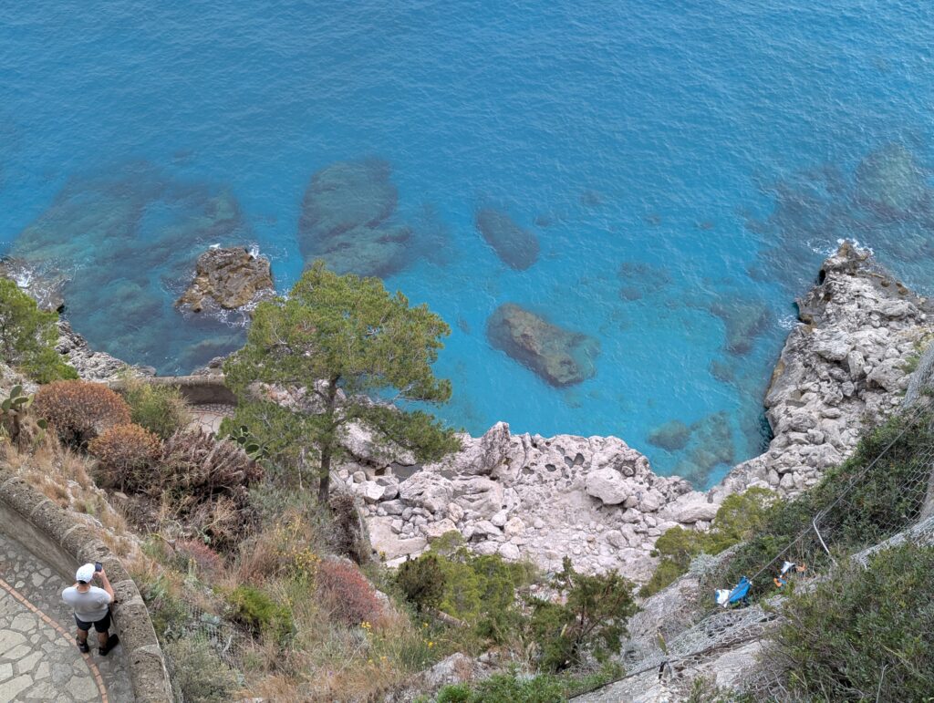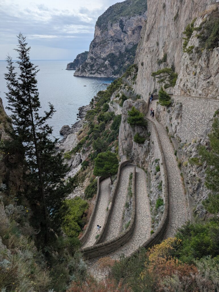 Krupp bol nemecký medzivojnový oceliarsky magnát čo za vojny robil delá, a sem si prišiel užívať prachy a liečiť astmu. Aby po sebe zanechal niečo, čo neni zo železa, postavil tu spomínanú cestu, ktorá sa vlní až k vlnám, súlade s prírodou (ako to bolo veľakrát vyzdvihnuté na infotabuliach lemujúcich chodník). Výhoda cesty je, že sem nemôžu autá a nejde sem ani lanovka, takže 99.9% turistov sem nepáchne a máme kvázi nerušenú prechádzku s výhľadom na more. Možno to je aj tým, že ideme posledným trajektom z ostrova naspäť do Neapolu, a preto ostatní už odišli.