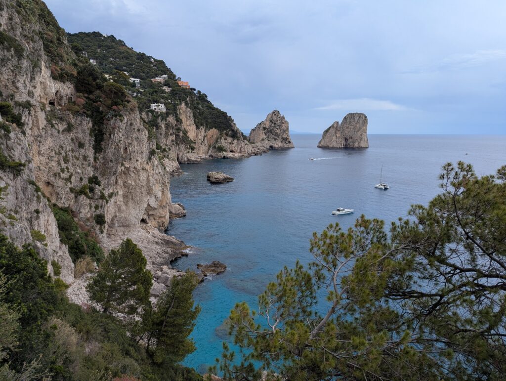 Capri je vraj skoro tak populárny ako Amalfi (kam sme, možno žiaľbohu, alebo chvalabohu, že žiaľbohu, už nestihli ísť, i keď to v pláne bolo). A vraj viac ako Sorrento. Ťažko sa mi však rozlišuje, či mi na ulici zavadzia a vadí milión turistov, alebo milión a pol. Ešte sa poriadne ani nevylodíme a už máme kúpenú okružnú jazdu okolo ostrova, ktorá nám dá výnimočnú príležitosť schovávať sa pred dažďom v krytej lodi s 20timi dôchodcami a nerozumieť niečomu, čo vocca trepe do mikrofónu. Dáke grotá a kamene lásky a bla. Reproduktorček ako na vlakovej stanici v Šuranoch.