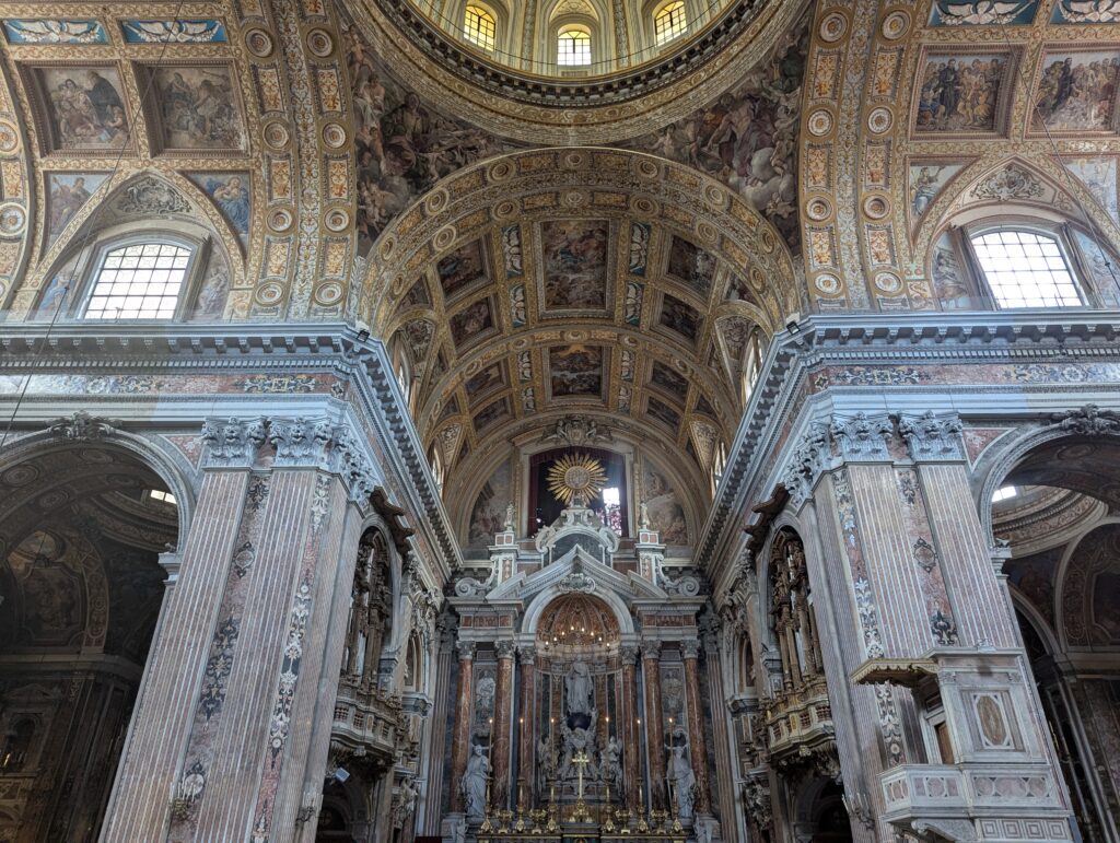 Tretí deň je deň odchodu. Páčilo sa mi zostať v rovnakom ubytovaní 2 noci, ale 16 ubytovaní za 17 dní je aj tak drsnosť. Baliť sa vieme už mega efektívne, keď navyše postupne vyhadzujem veci, ktoré sa kazia. Po raňajkách sa ideme uistiť, že krabice na bajky budú, a ideme potom pozrieť zostávajúce pamiatky mesta, ktoré sme nestihli prvý deň. Je tu tradične zmeska kostolov, hradov a fontán. Kostol Gesù Nuovo je parádny, normálne by som si ho pozeral aj dlhšie, keby nás kostolík, či čo to bolo, nevyhodil, že ide na obed a teda chiesa chiusa. Hm.