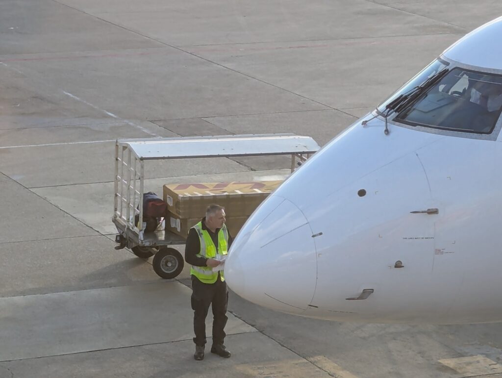 Na letisku 2x pokazím mašinu na nadrozmernú batožinu, 1x turniket na lístky a 1x oddeľovače na hadíkovanie ľudí. Pri nástupe do lietadla vidíme nakladačov batožiny, jak smutne zalamujú nad krabicami rukami. 2x hm.