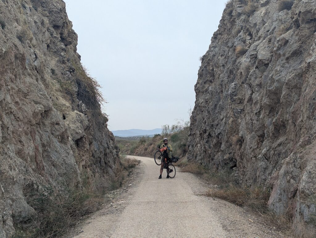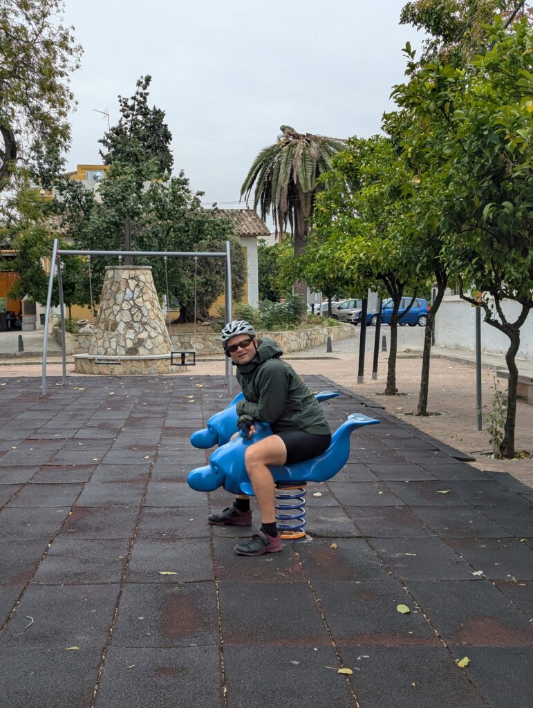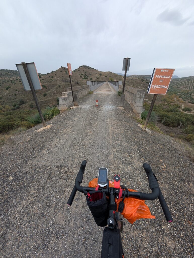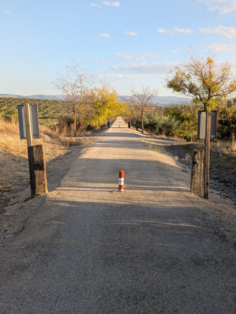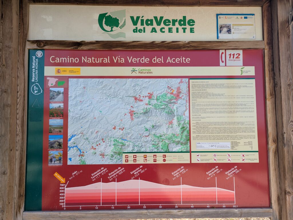 Vystupujeme v Jaén. Tu za mestom začína Via Verde del Acéite, čo je ďalšia bývalá železnica prerobená (sčasti za EU peňáz) na rekreačnú cestu pre všetkých. Tu na značkách kto komu dáva prednosť nefigurujú kone, ale vozičkári. Odvážni a otrlí, lebo kvalita cesty je veľmi variabilná. Alebo s odpruženými vozíkmi. Pogo Stick namiesto paličiek 🤷♀️