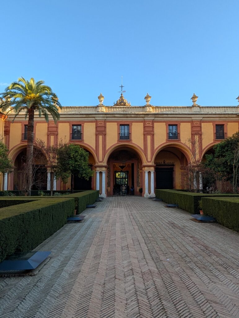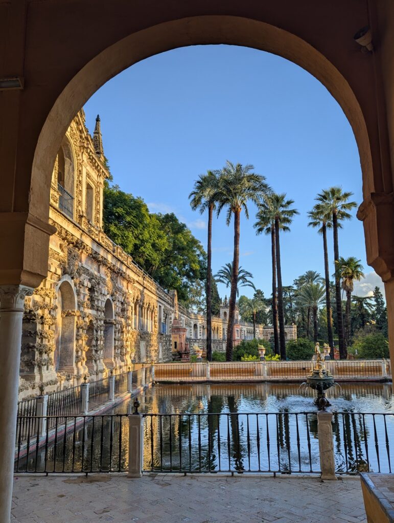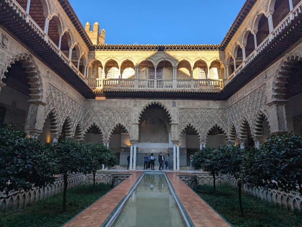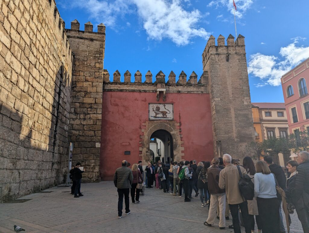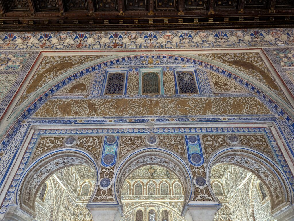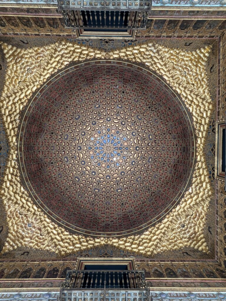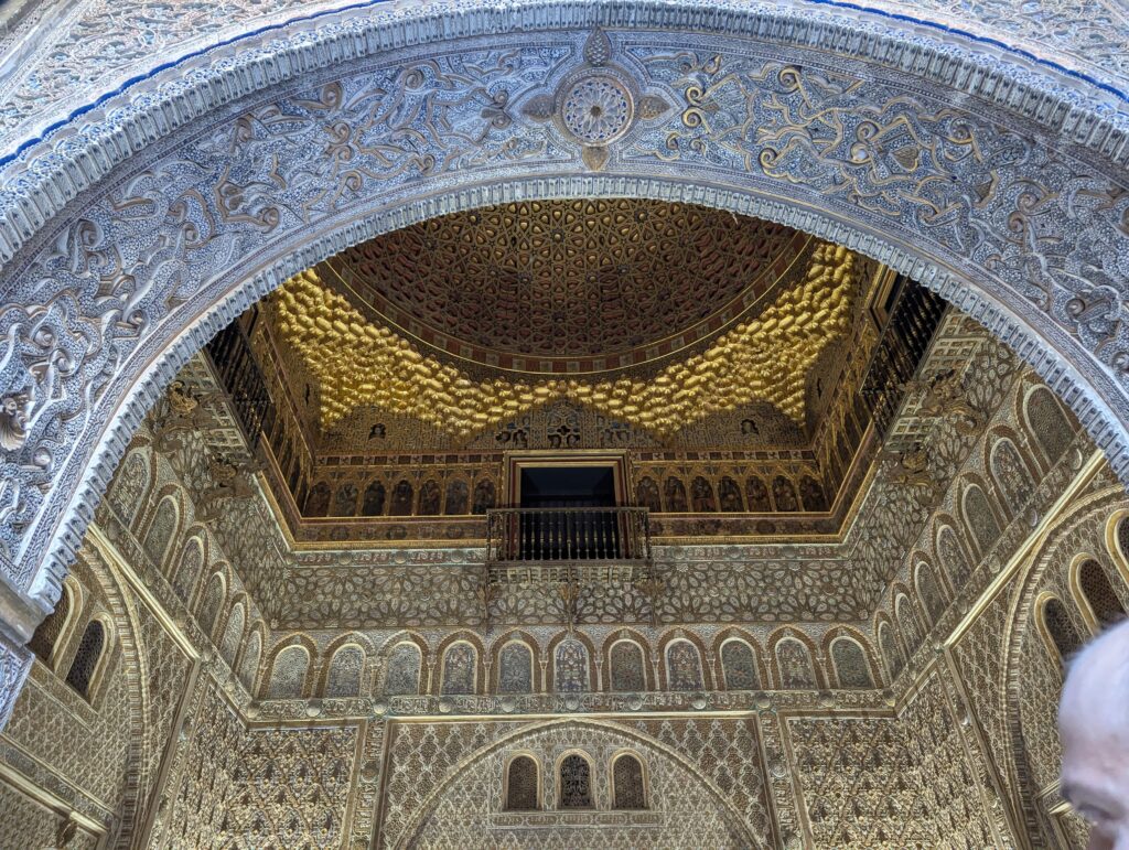 – Alcazar – veľká pevnosť v centre mesta. Vraj ju furt využíva španielsky kráľ (druhé poschodie), aj keď teda ja byť kráľ, nechcel by som, aby sa mi po obývačke alebo garáži túlali milióny turistov ročne. Vnútri je pevnosť dosť prázdna, žiadne historické truhlice a delá, ako to býva inde. Možno na to existuje dáky špeci lístok, ale popravde, boli sme radi, že sme zohnali tento obyčajný. Na obdivovanie je tu hlavne architektúra “Mudéjar” (kresťanskí umelci robia akože moslimské umenie pre kresťanských zákazníkov) a farebné kachličky. Jediný problém čo tu prítomní architekti majú, je, že tie trojité dverné pekne zdobené oblúky a pávmi a kdečím ďalším si nemôžu obchytkať, lebo sú moc vysoko. Kachličky nemajú zďaleka takú taktilnú hodnotu ako štrukturovaný skorobetón. Stavitelia Alcazaru na to ale mysleli a po celej stavbe sú rozmiestnené veľké bazéniky, kde sa zbierajú slzy architektov a po vysušení v hradných záhradách predávajú soľ v suvenírshope. Záhrady boli zavreté, lebo veľa dažďa 🥹