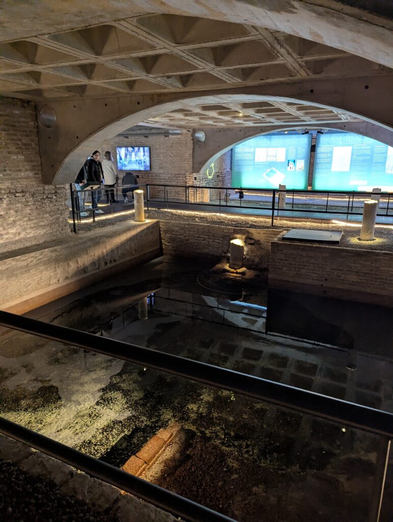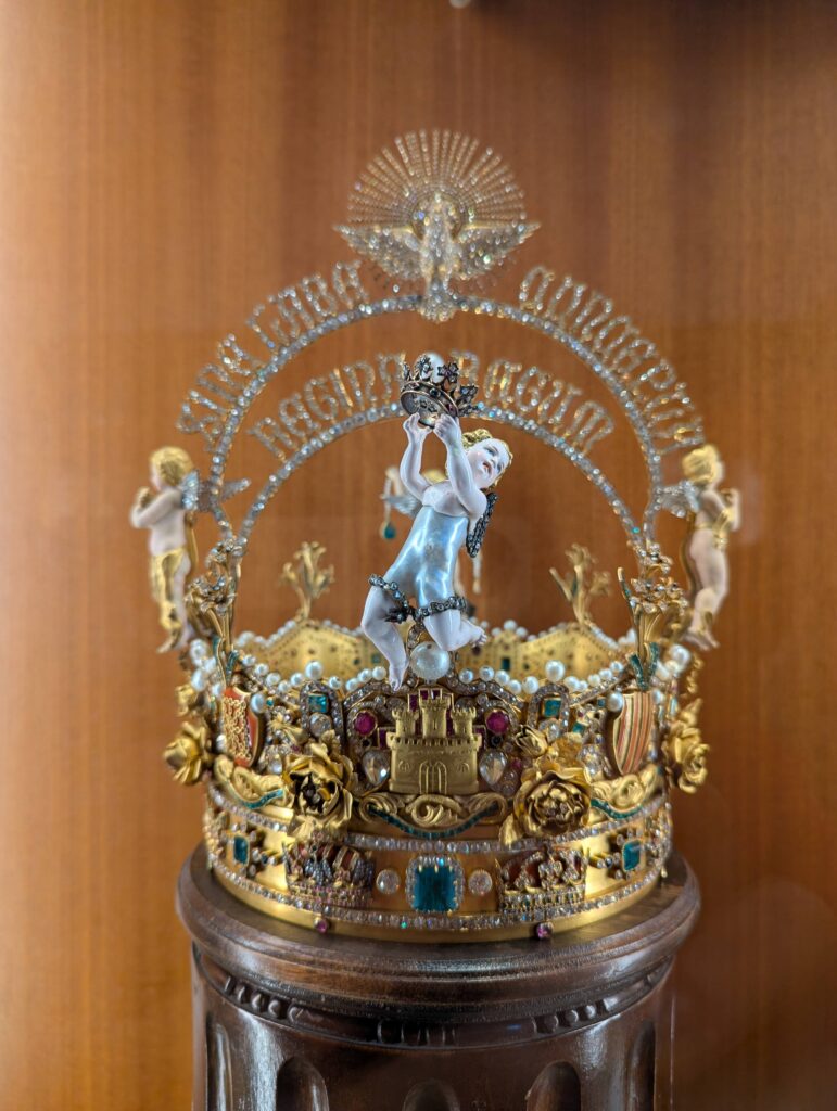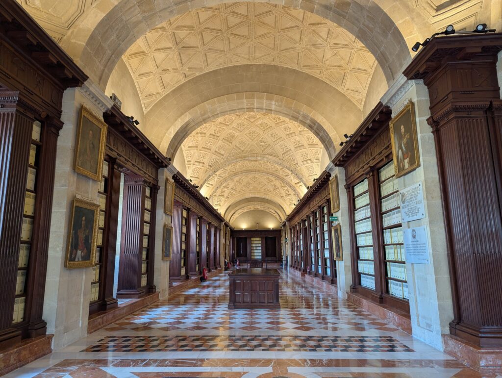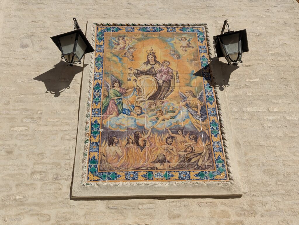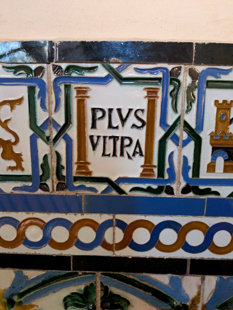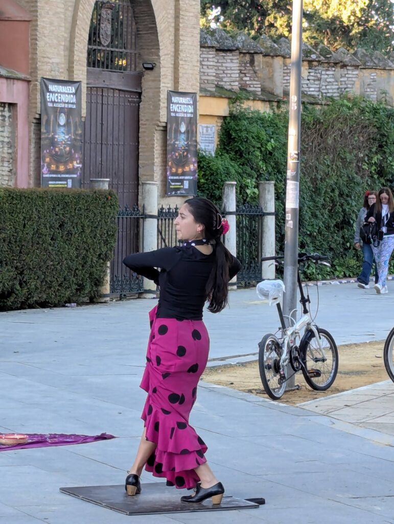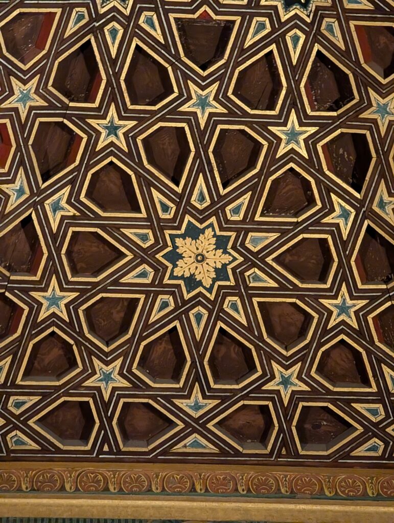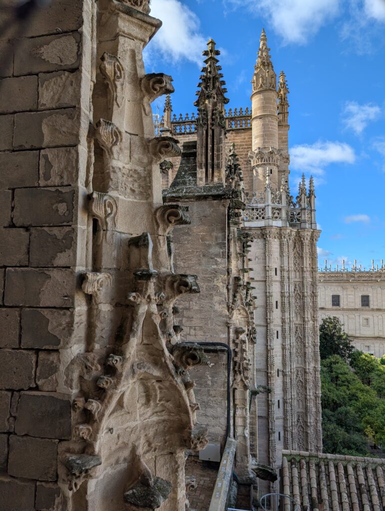 – Alcazar – veľká pevnosť v centre mesta. Vraj ju furt využíva španielsky kráľ (druhé poschodie), aj keď teda ja byť kráľ, nechcel by som, aby sa mi po obývačke alebo garáži túlali milióny turistov ročne. Vnútri je pevnosť dosť prázdna, žiadne historické truhlice a delá, ako to býva inde. Možno na to existuje dáky špeci lístok, ale popravde, boli sme radi, že sme zohnali tento obyčajný. Na obdivovanie je tu hlavne architektúra “Mudéjar” (kresťanskí umelci robia akože moslimské umenie pre kresťanských zákazníkov) a farebné kachličky. Jediný problém čo tu prítomní architekti majú, je, že tie trojité dverné pekne zdobené oblúky a pávmi a kdečím ďalším si nemôžu obchytkať, lebo sú moc vysoko. Kachličky nemajú zďaleka takú taktilnú hodnotu ako štrukturovaný skorobetón. Stavitelia Alcazaru na to ale mysleli a po celej stavbe sú rozmiestnené veľké bazéniky, kde sa zbierajú slzy architektov a po vysušení v hradných záhradách predávajú soľ v suvenírshope. Záhrady boli zavreté, lebo veľa dažďa 🥹